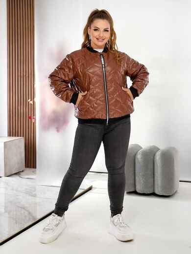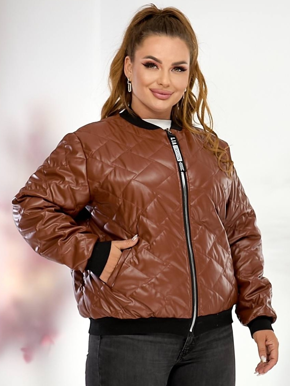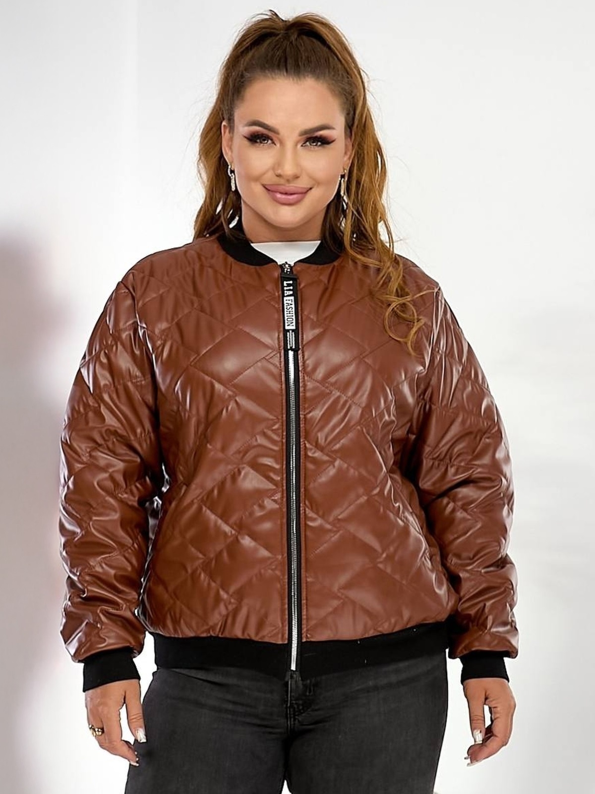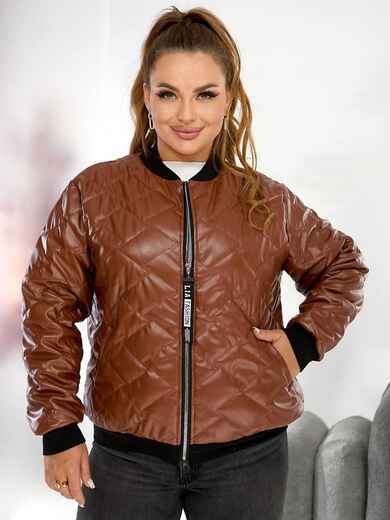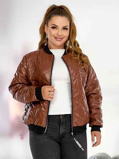 Стьобаний бомбер з екошкіри. Модель з підкладкою Лаке. Короткий комір, манжети і низ виконані гумкою. Застібається на блискавку. Утеплювач – синтепон 100. Розрахований на температурний режим до +5°C.
