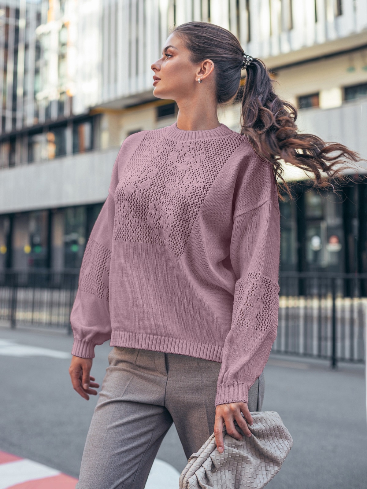 В’язаний светр із м’якої пряжі. Модель вільного крою забезпечує комфорт у носінні. Ажурне плетіння з перфорацією та квітковим мотивом на грудях і рукавах створює виразний акцент. Кругла горловина, низ і широкі манжети виконані у техніці «гумка», завдяки чому добре тримають форму та забезпечують акуратну посадку.