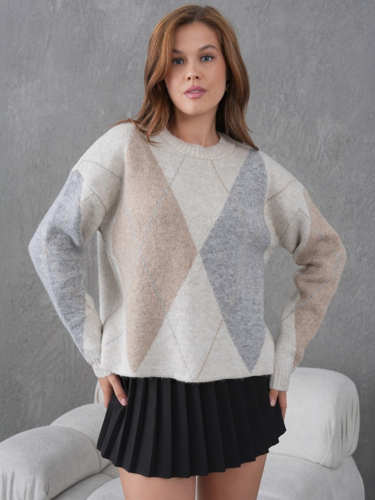 В'язаний джемпер з високоякісного турецького матеріалу з ромбоподібним візерунком. Круглий виріз горловини, манжети виробу виконані гумкою.