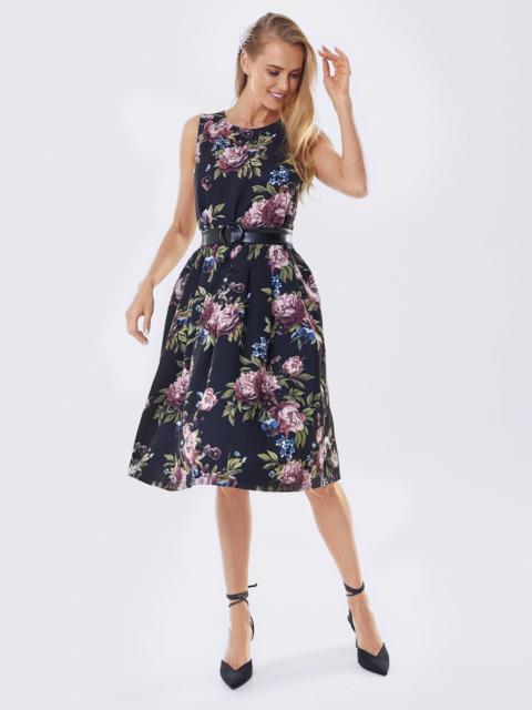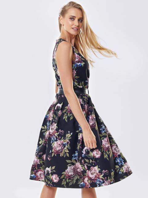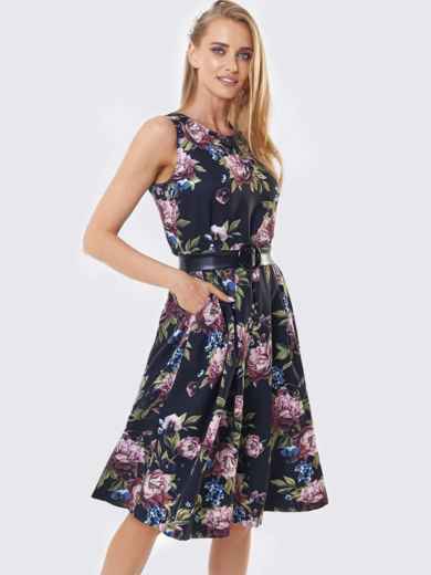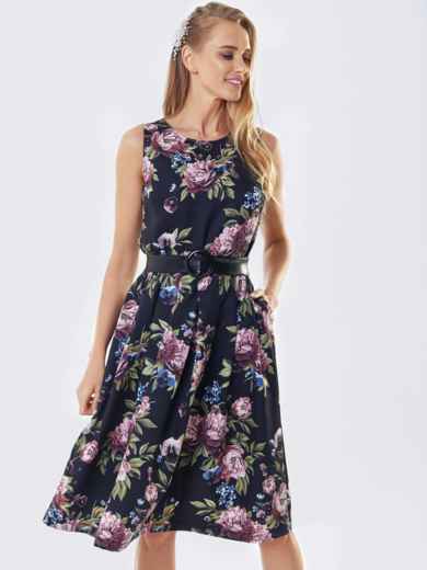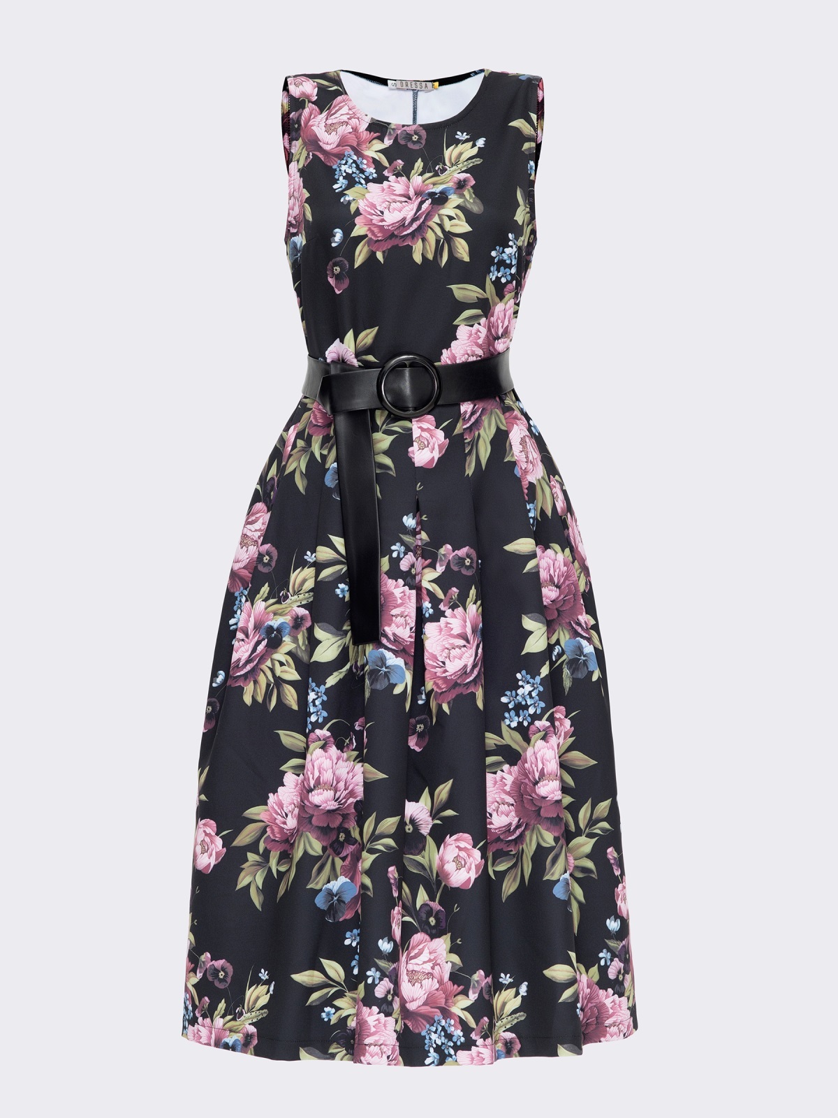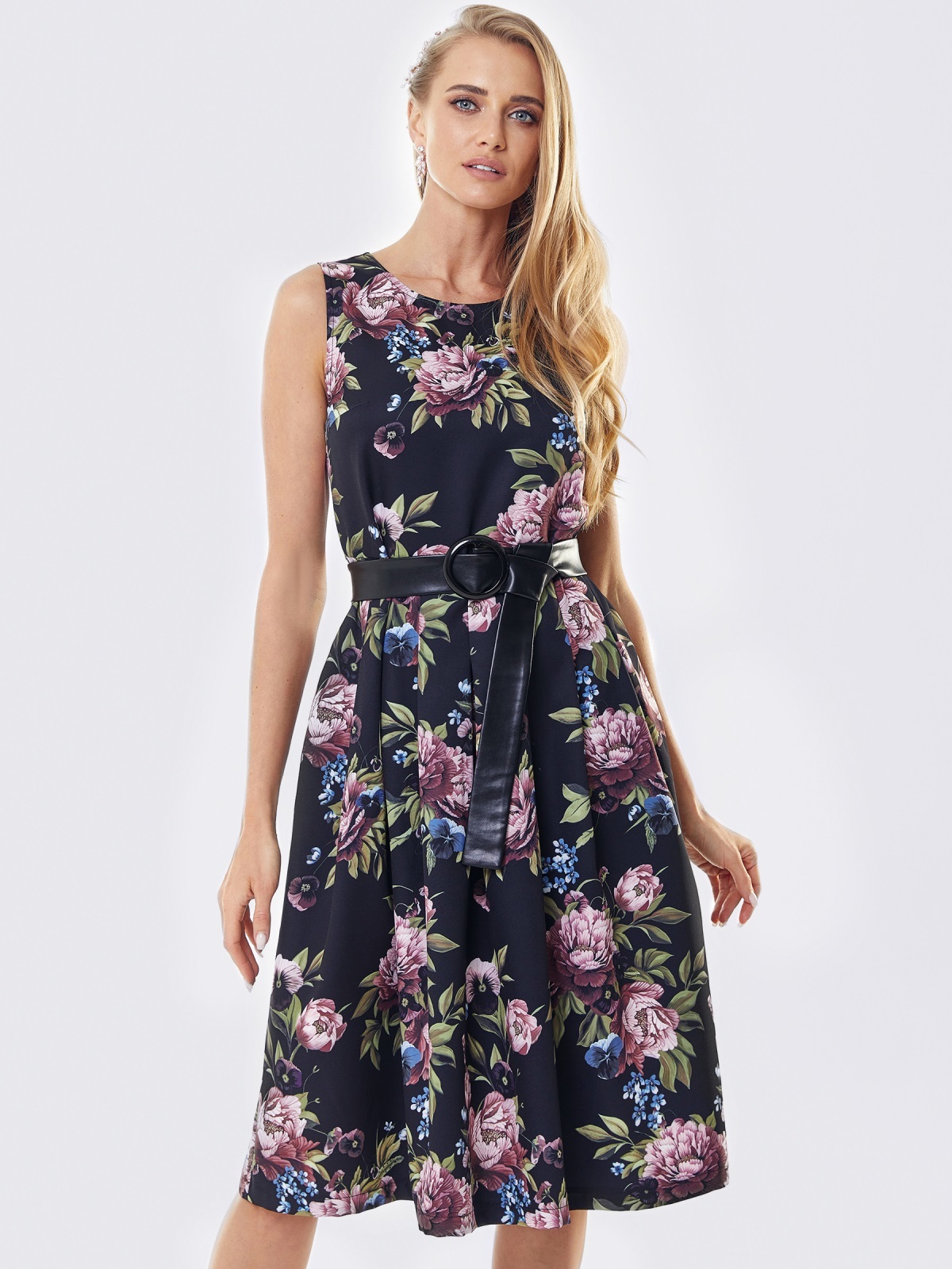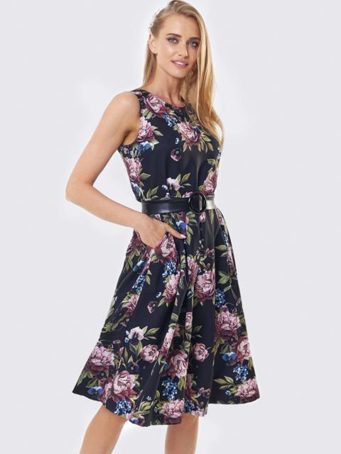 Плаття без рукавів в квітчастий принт. Модель відрізна вздовж талії зі складками на спідниці. Комплектується поясом з пряжкою.