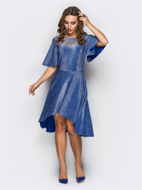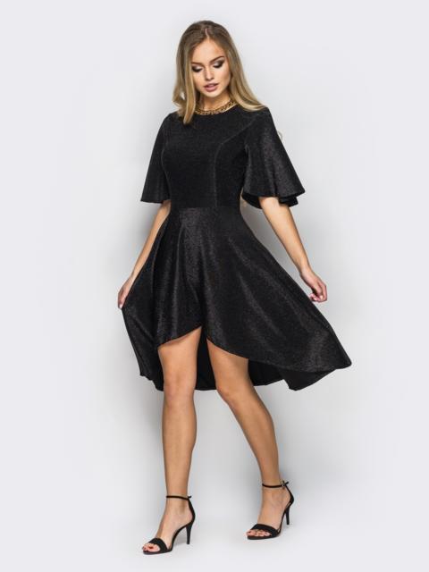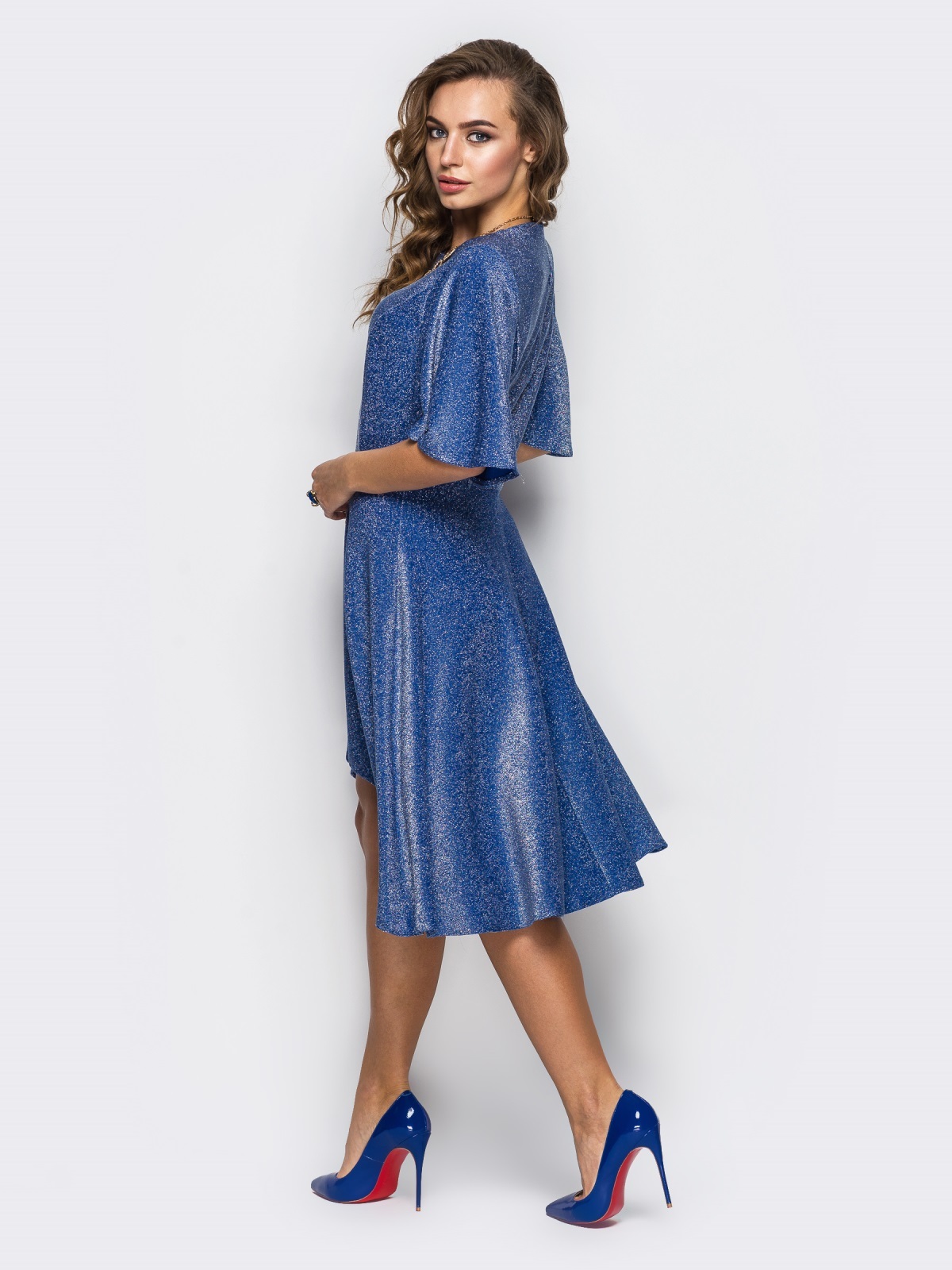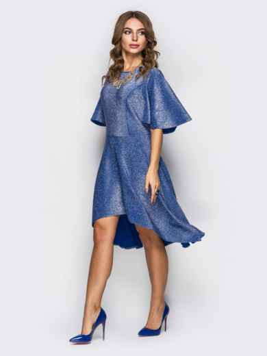 Стильна вечірня сукня із люрексу з подовженням на спинці. Відрізне по талії та рукав розкльошений. Виріз круглий. Виріб виконаний у вигляді каскаду, підкреслює ноги і робить їх стрункішими.