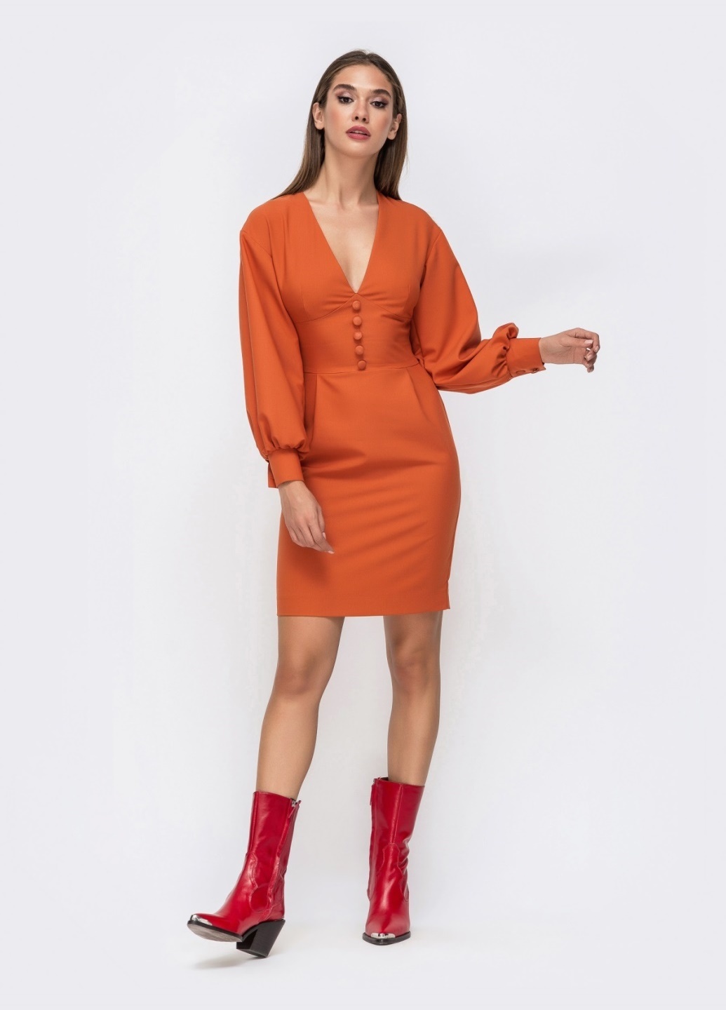Яскрава сукня-футляр із костюмної тканини з декоративними гудзиками по поличці. Модель з V-подібним вирізом горловини та об'ємними рукавами. Застібається на блискавку збоку. Добре підійде типам фігури «пісочний годинник» та «прямокутник».