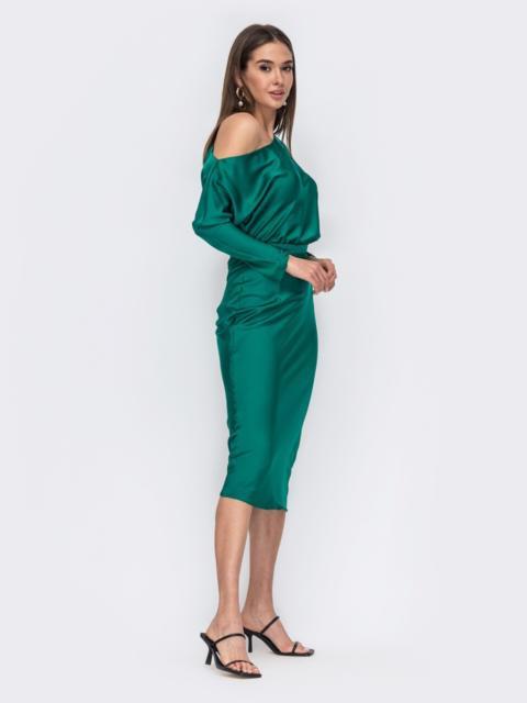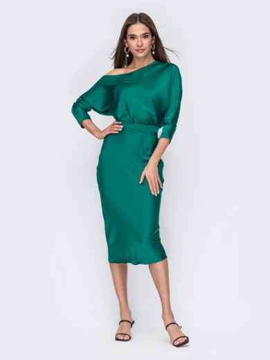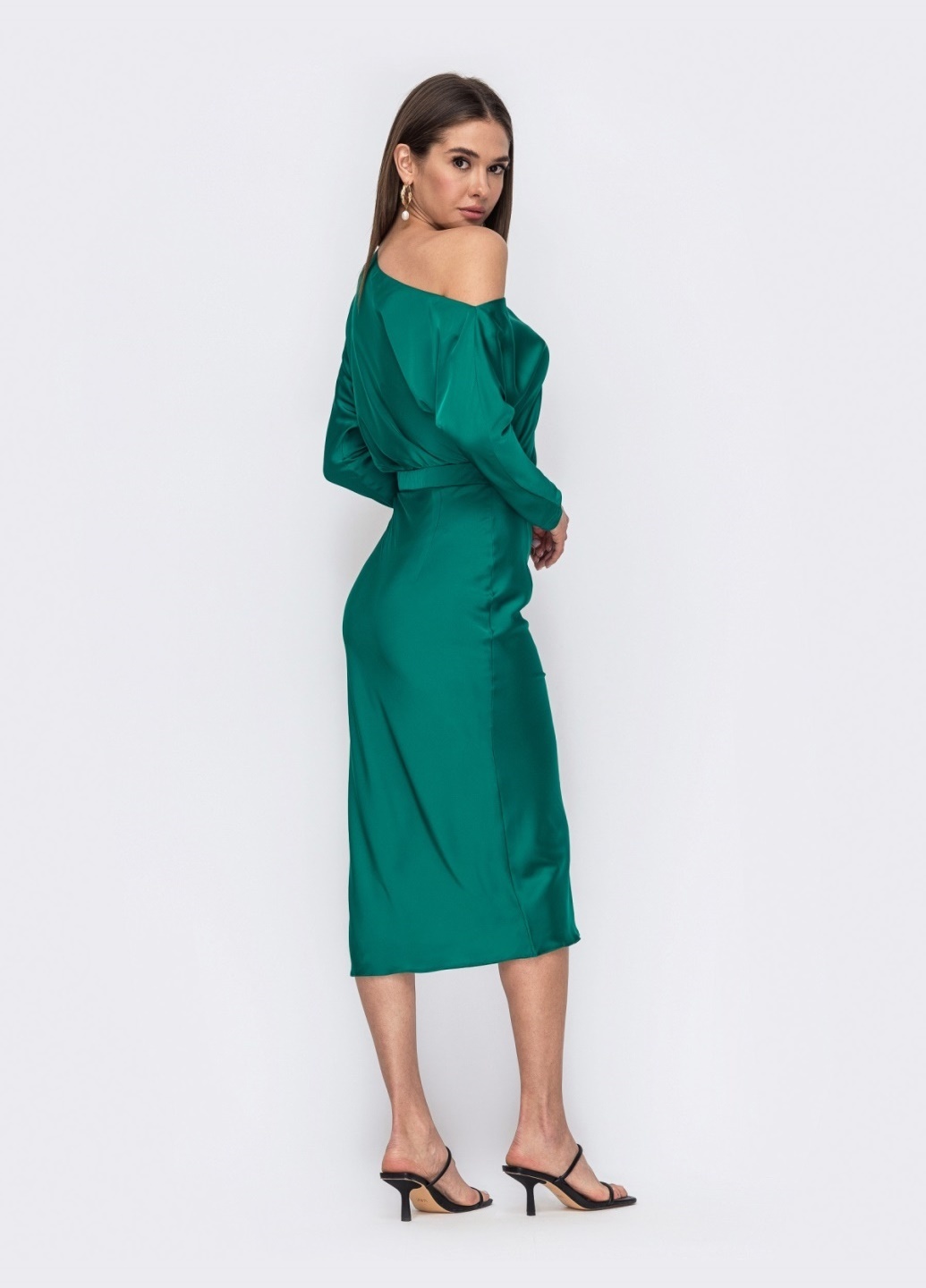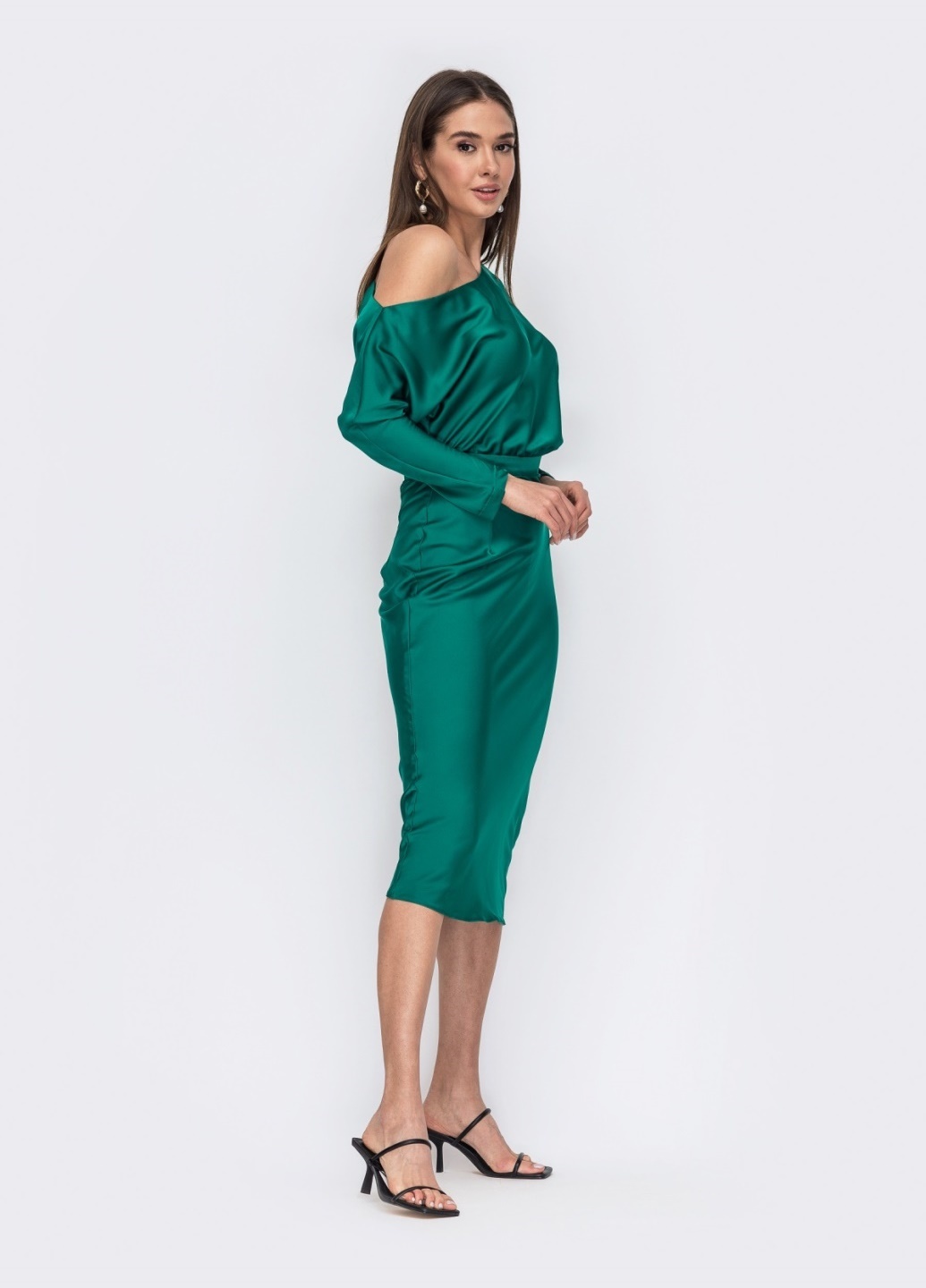 Жіноча сукня з відкритою лінією плечей зі штучного шовку. Модель з об'ємним суцільнокроєним рукавом і спідницею-олівцем. Застібається на блискавку збоку. Добре підійде власницям фігури "пісочний годинник" і "прямокутник".