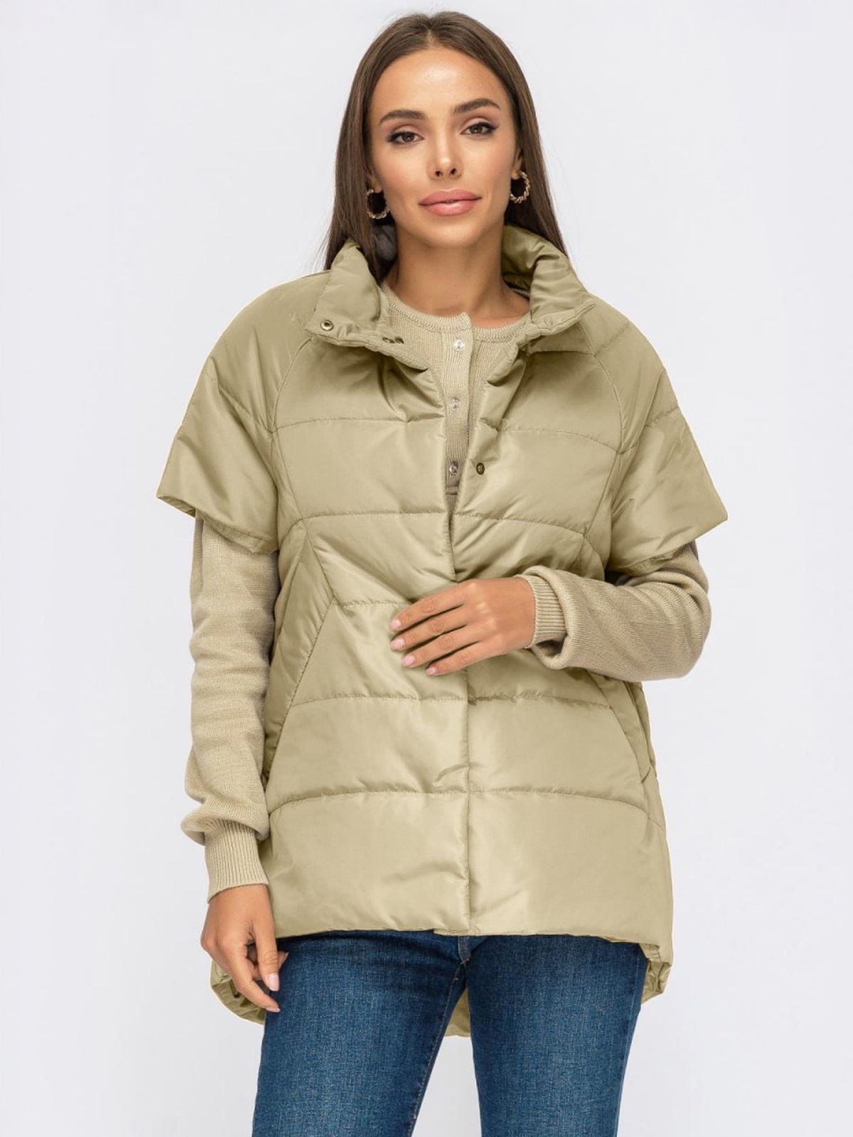 Демісезонний жилет з подовженою спинкою. Короткий рукав-реглан, по поличці - прорізні кишені. Застібається на кнопки. Утеплювач силікон 120.