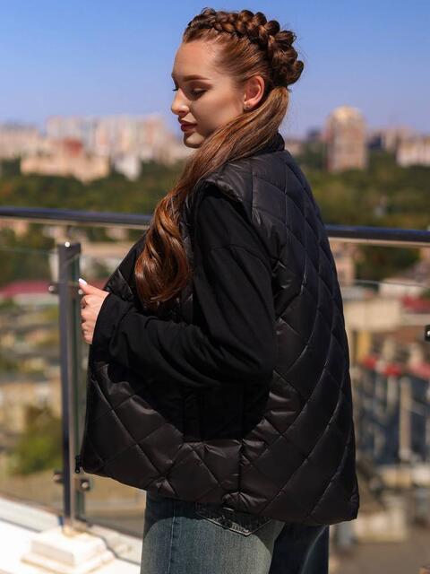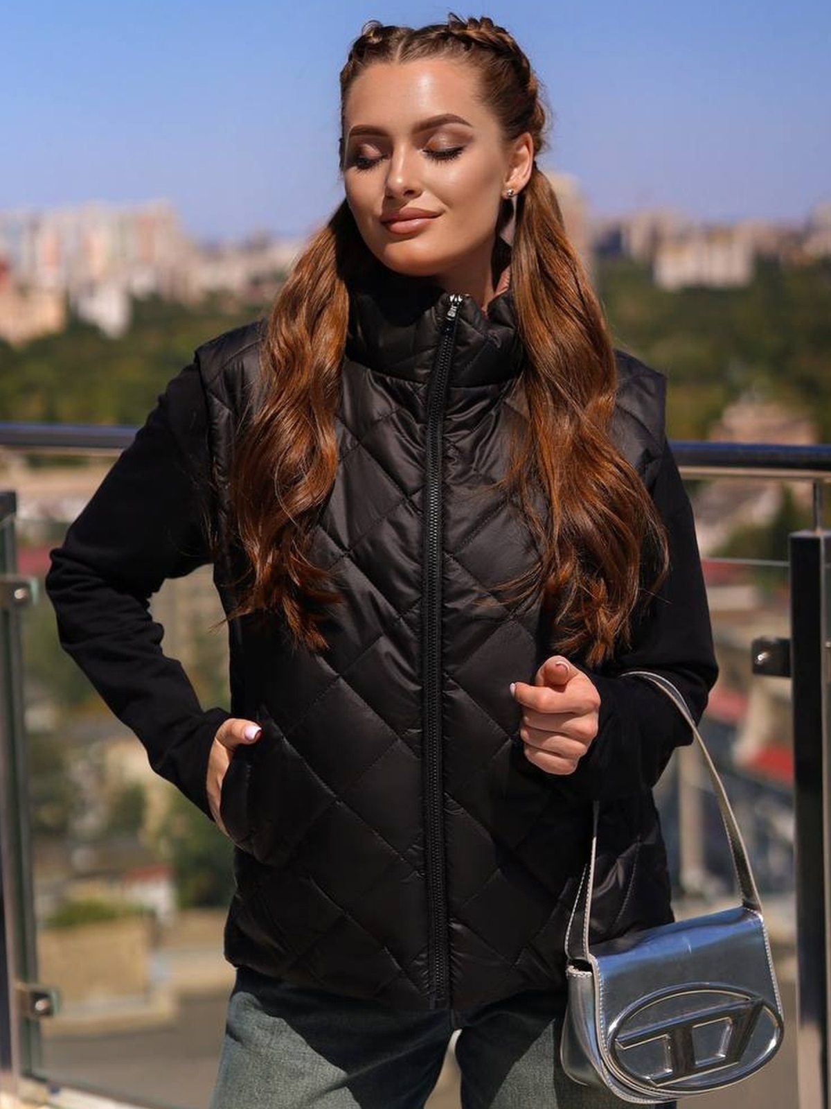 Стьобаний жилет на синтепоні 150 г/м² — універсальний вибір для міжсезоння. Модель з діагональною стібкою, яка надає рельєф і утримує наповнювач на місці, забезпечуючи довговічність виробу. Комір-стійка захищає від вітру. Збоку розташовані кишені. Низ із фіксатором для стягування з боків. Застібається на блискавку. Розрахований на температурний режим від +10 °C до +5 °C.