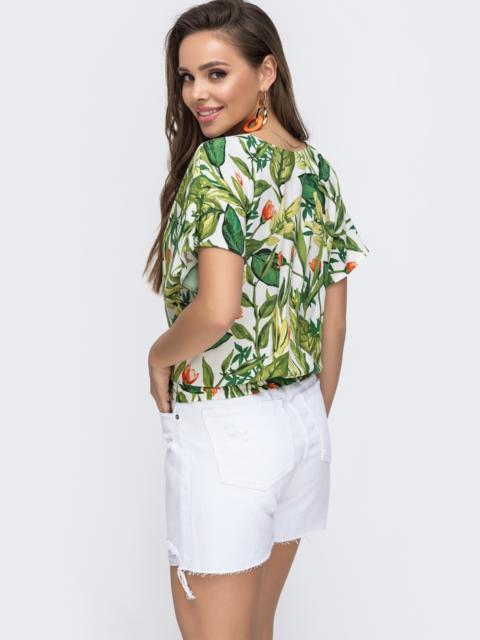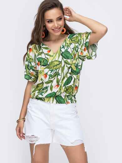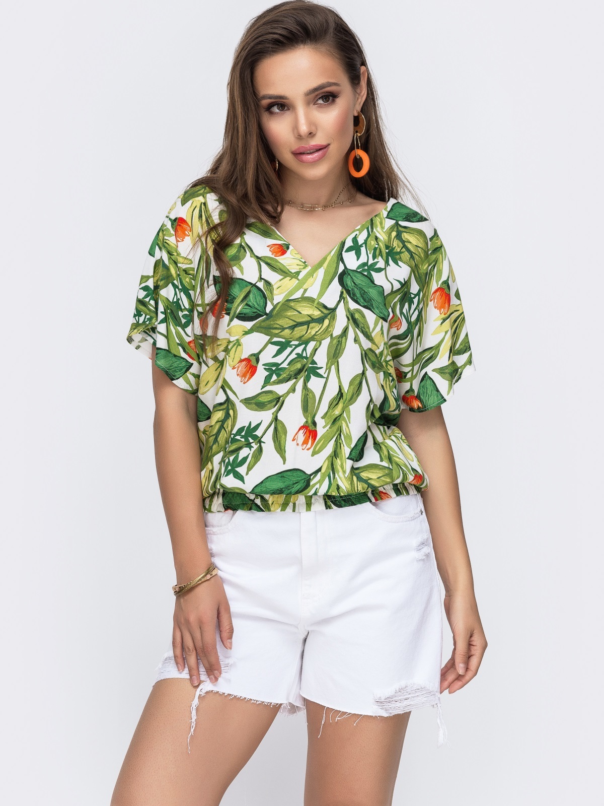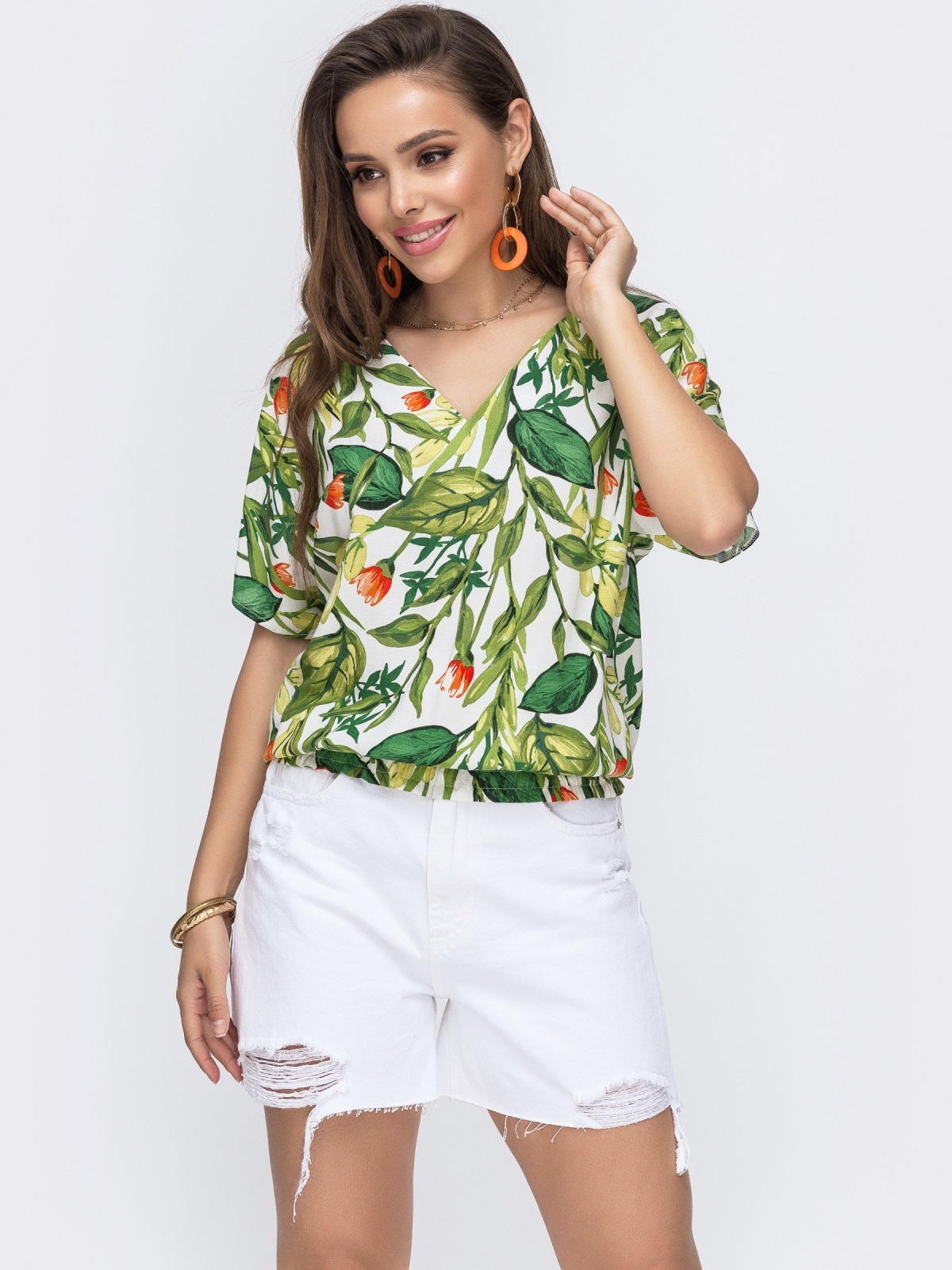 Легкая блузка из штапеля с треугольным вырезом горловины. Модель свободного кроя с вафельной сборкой по низу.