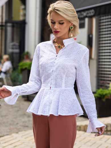 Стильная блузка приталенного кроя с баской. Модель с воротником-стойкой и длинным рукавом, дополненным оборкой. Застегивается на пуговицы и навесные петли. Изделие без подкладки. Прекрасный вариант для летнего образа в деловом стиле.