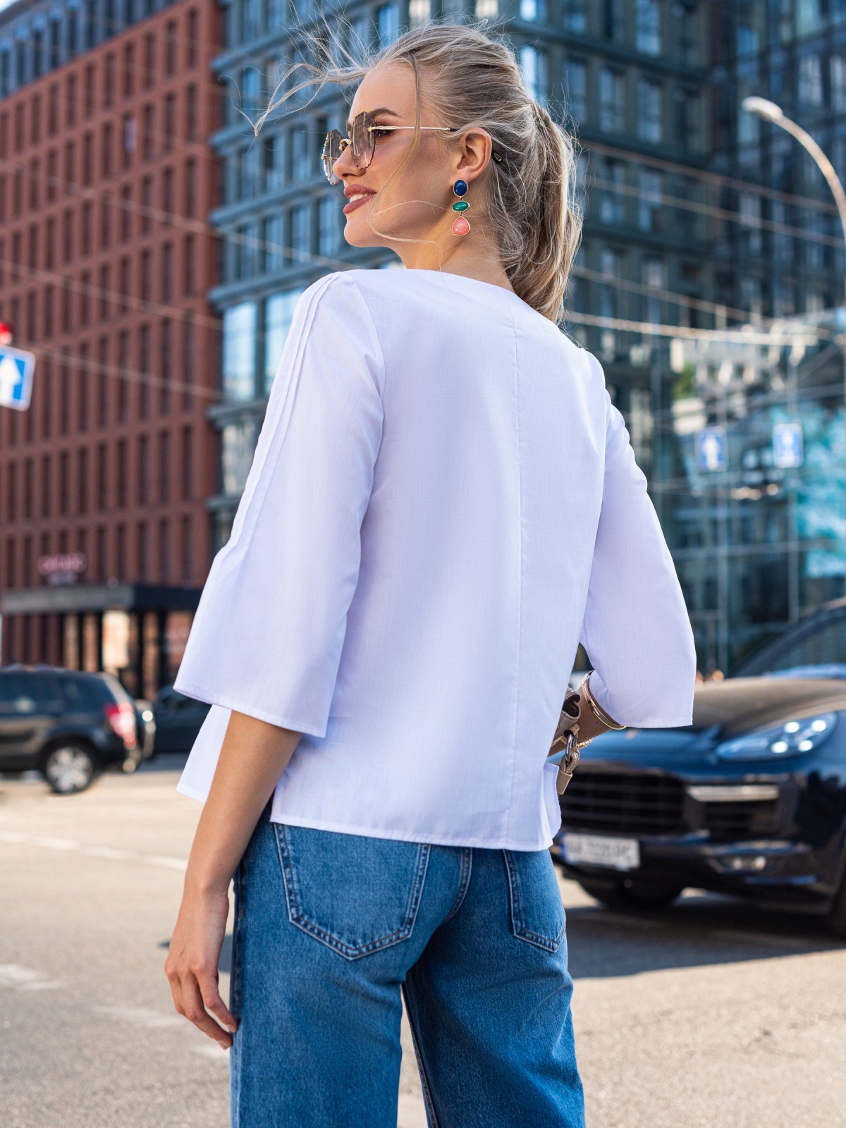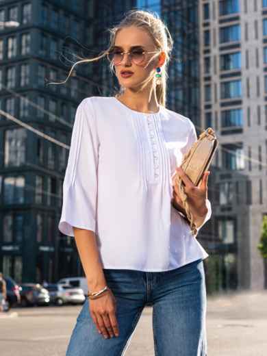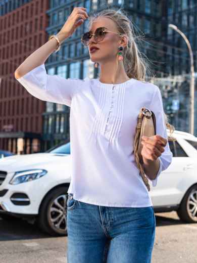 Бавовняна блузка прямого крою з дрібними застроченими складками на поличці. З боків невеликі розрізи. Застібається на ряд ґудзиків вздовж планки.