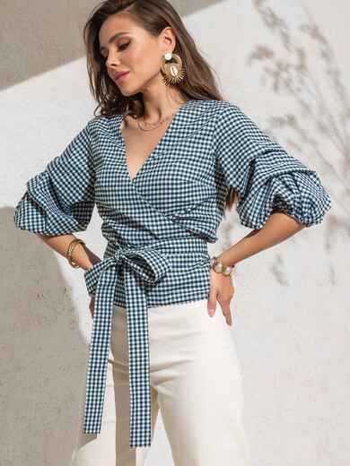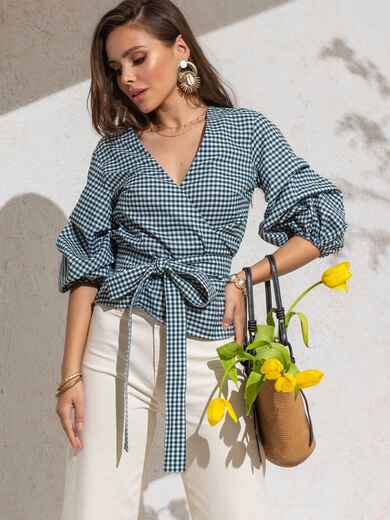 Ефектна блузка на запах з бавовни в клітинку віші. Об'ємні рукави з защіпами і еластичним манжетом. Запах фіксується вшитим поясом.