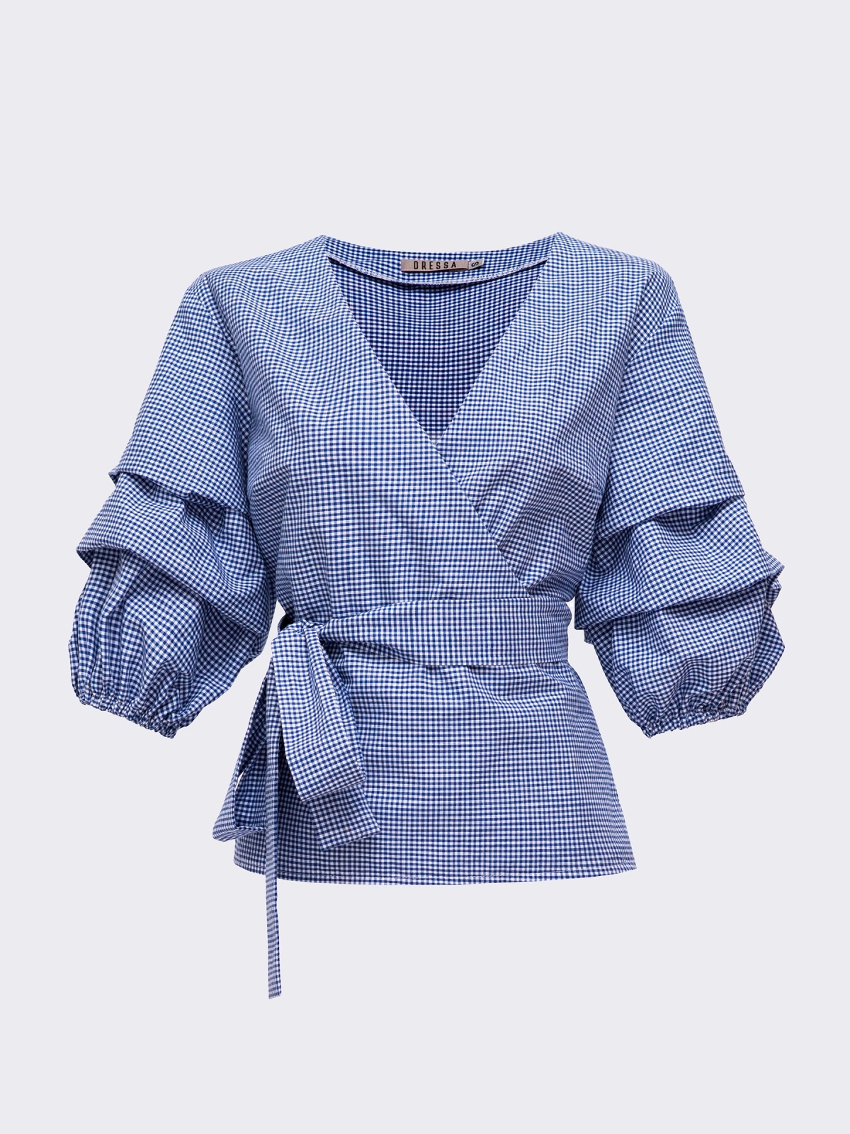 Бавовняна блузка на запах в дрібну клітинку віши. Об'ємні рукави з защіпами і еластичним манжетом. Запах фіксується вшитим поясом.