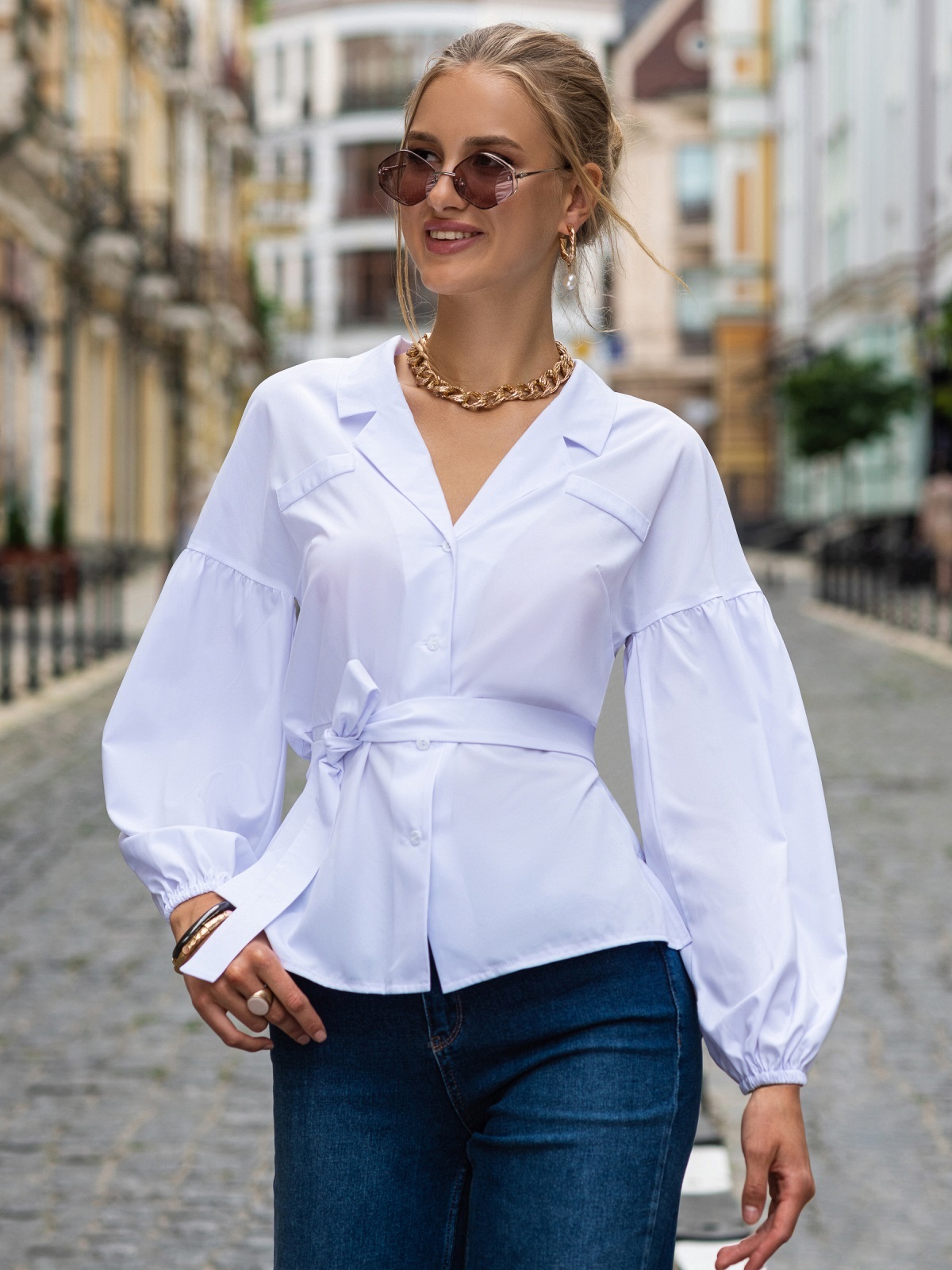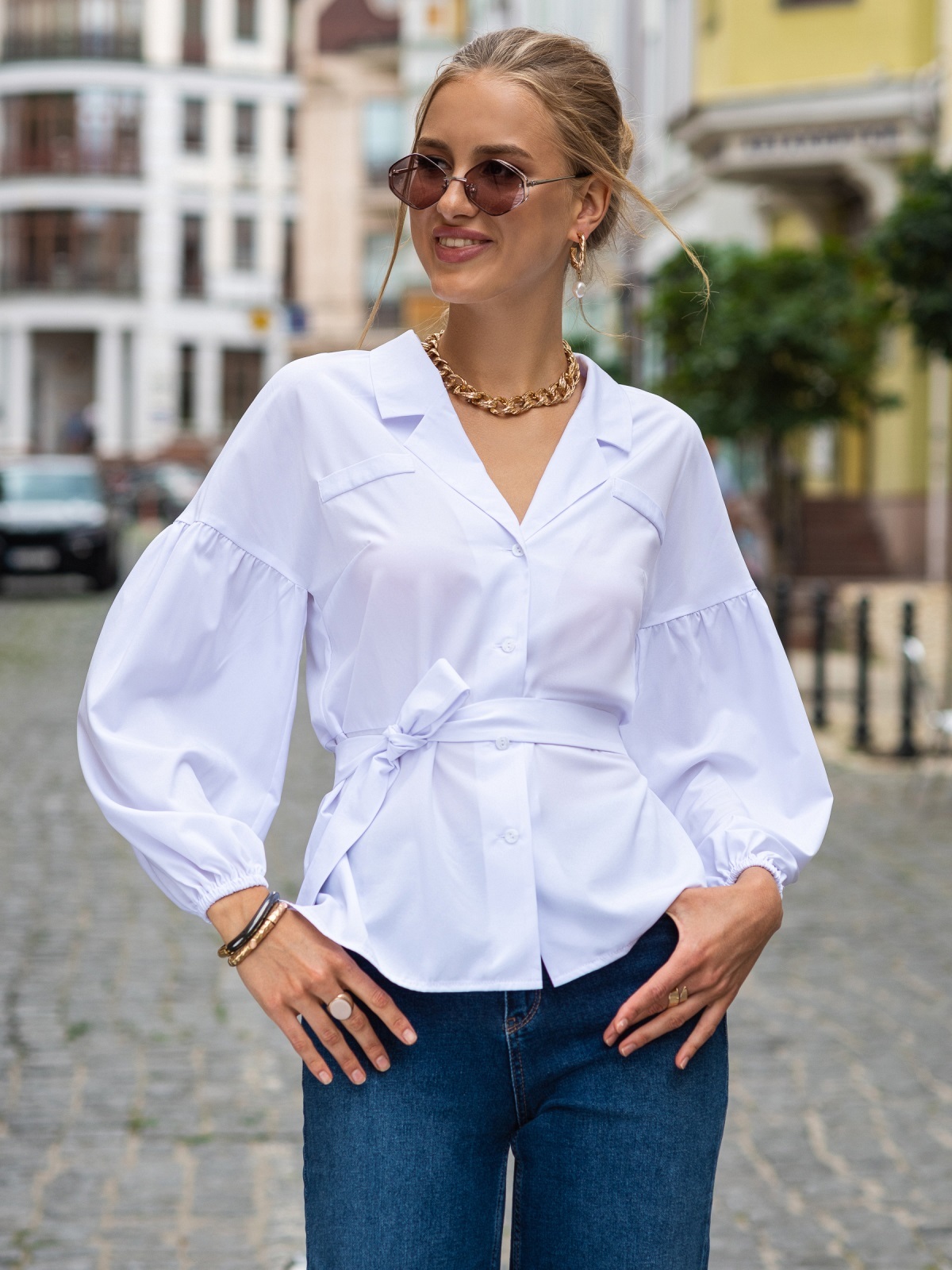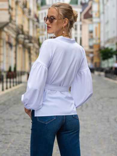 Ефектна блузка зі спущеною лінією плечового шва і об'ємними рукавами з еластичним манжетом. Модель прямого крою з відрізом по талії. Пояс з основної тканини в комплекті.