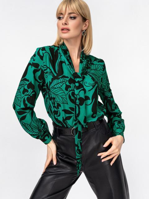 Блузка прямого крою з коміром-стійкою і довгим об'ємним рукавом, призібраним на резинку знизу. З боків передбачені невеликі розрізи. Застібається на ґудзики ззаду.