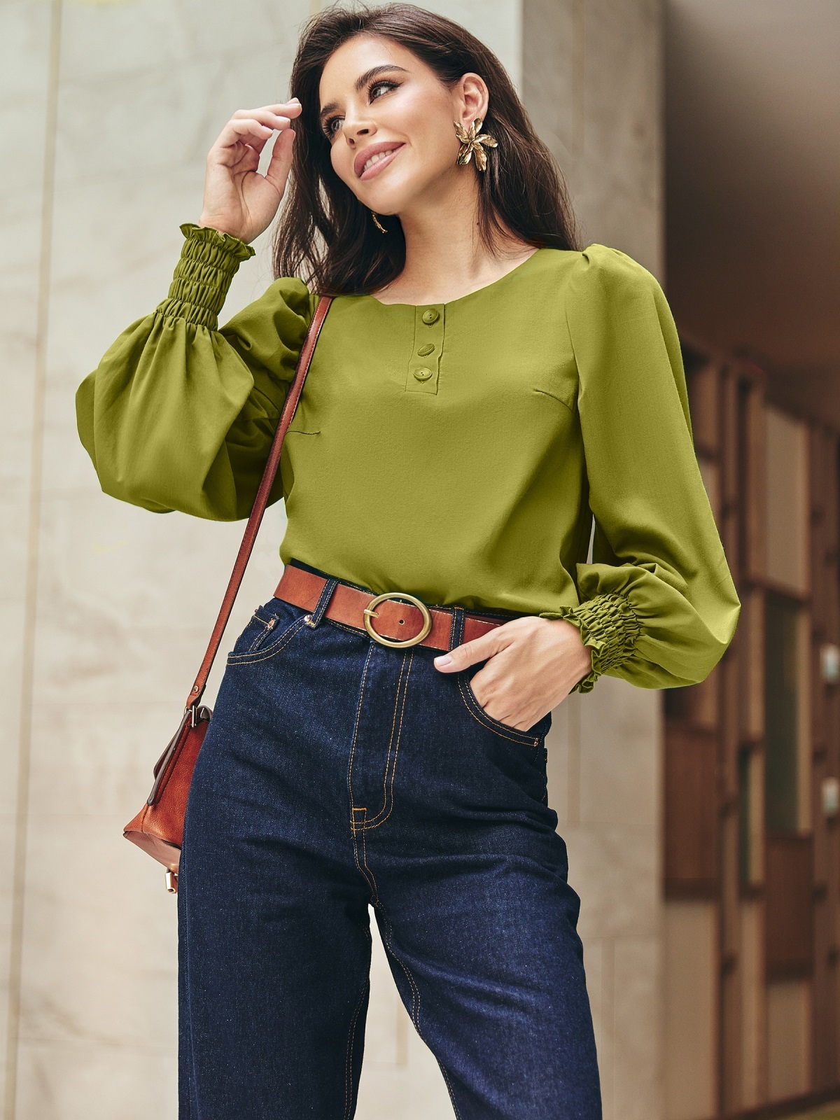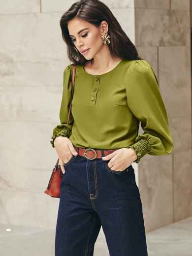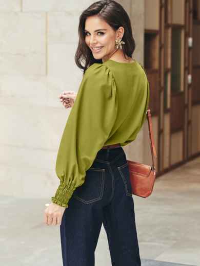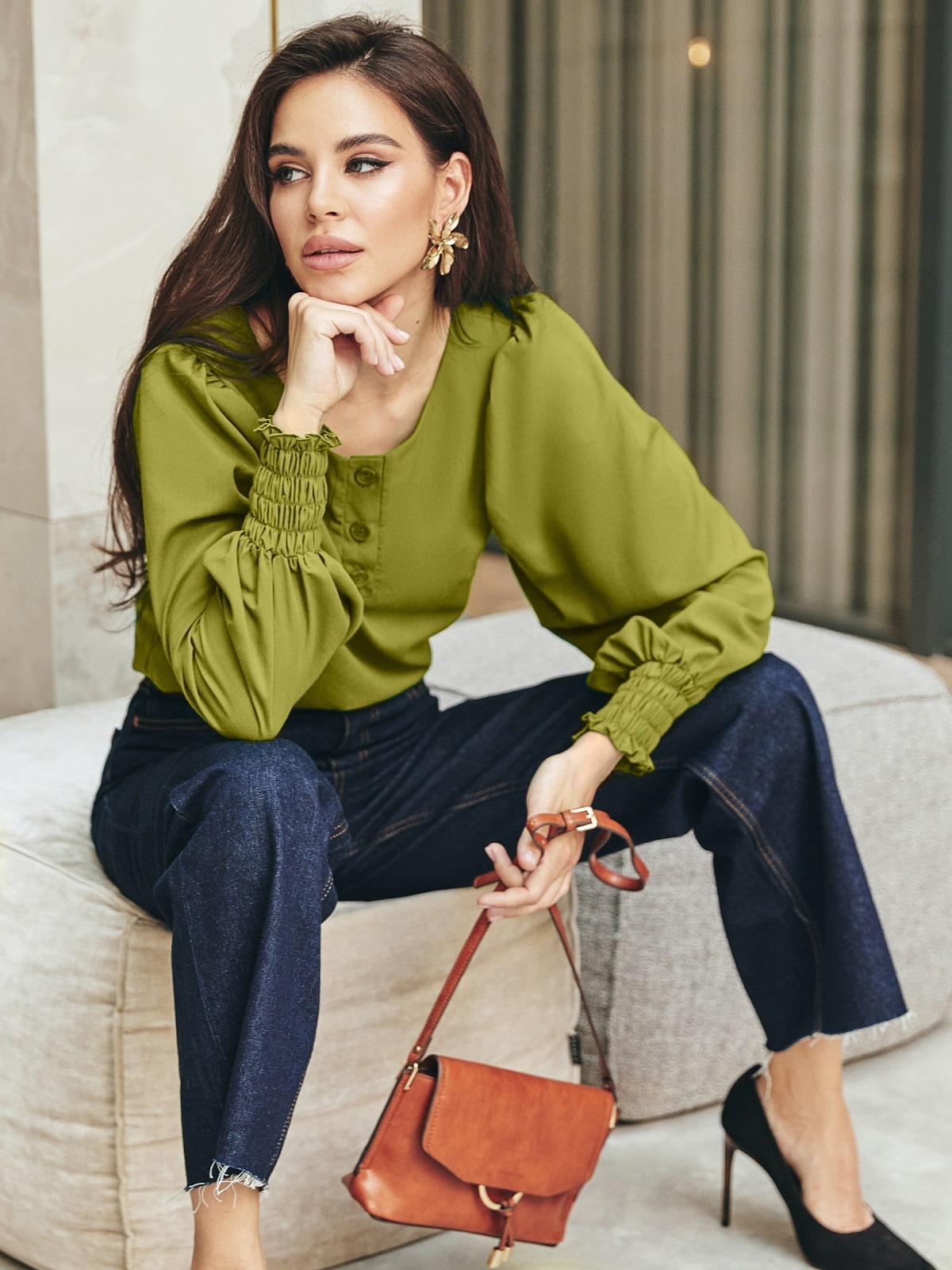 Блузка прямого крою з об'ємними рукавами, призібранними на еластичний манжет. З боків передбачені невеликі розрізи. Застібається на ґудзики вздовж планки.