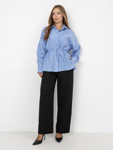 Принтована блуза з відкладним коміром та короткими рукавами. Застібається на ґудзики за планкою.