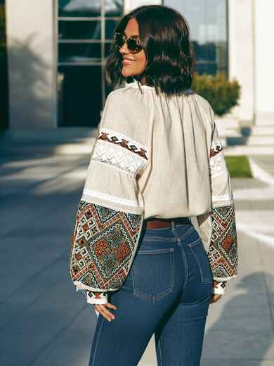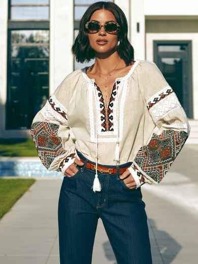 Блузка з високоякісного турецького матеріалу. V-подібний виріз доповнений зав’язками з китицями. Поличка та рукави декоровані вишивкою та тасьмою. Манжети із застібкою на ґудзик.