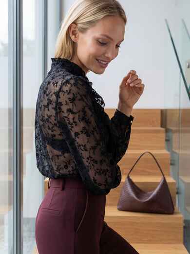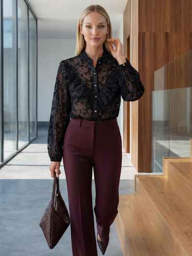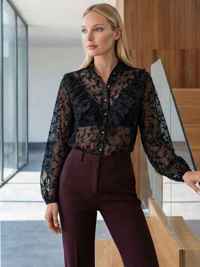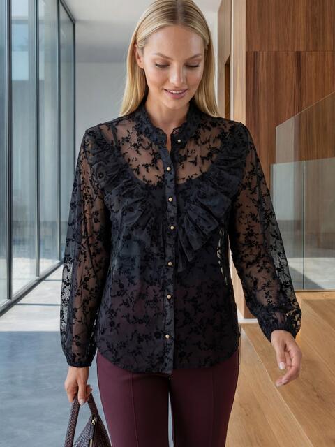 Елегантна блузка виконана з легкої прозорої тканини з фактурною квітковою вишивкою. Поличка декорована рюшами. Модель з коміром-стійкою і рукавами з манжетами на ґудзику. Застібається на ґудзики.