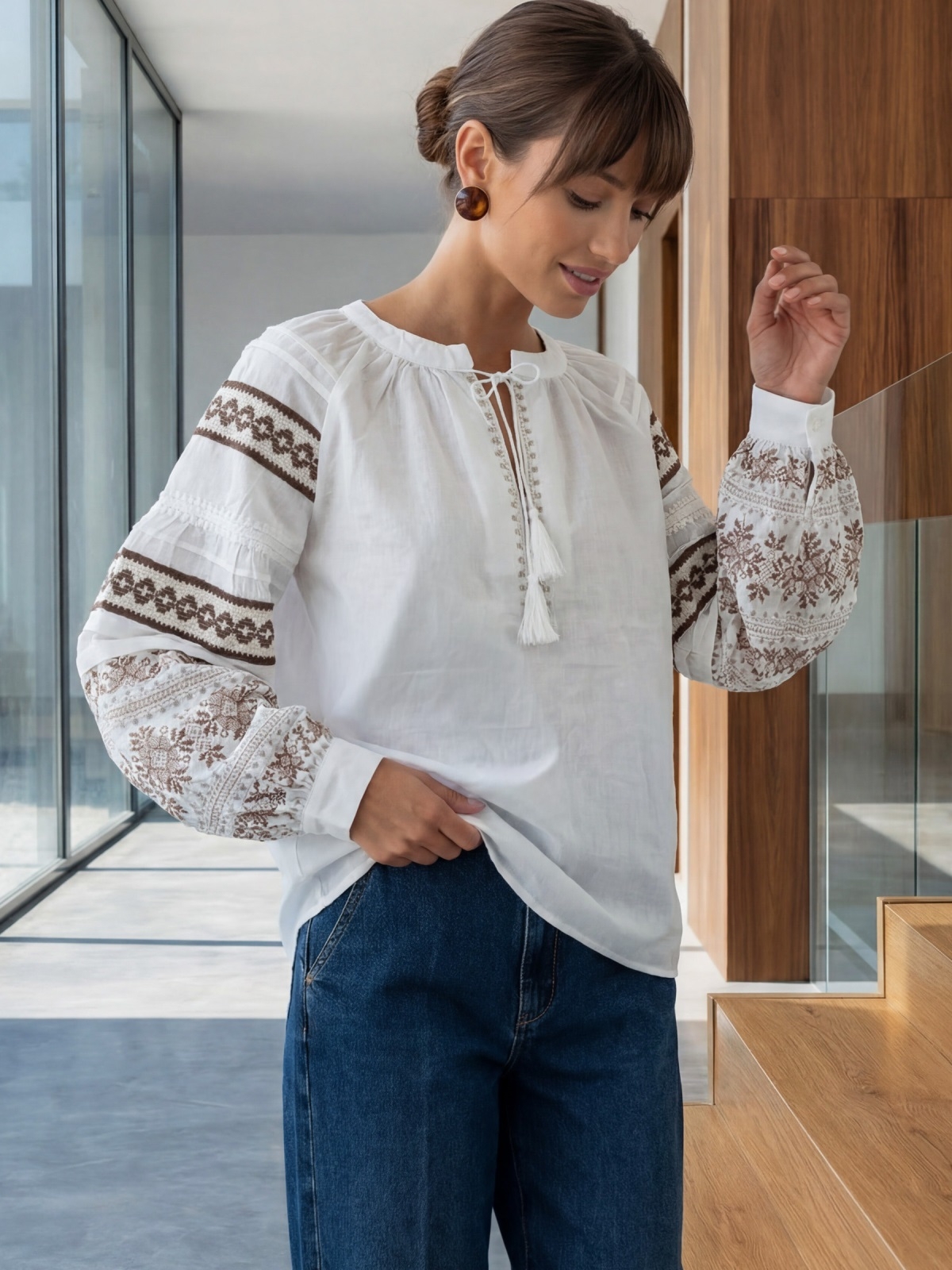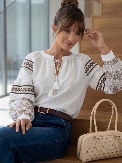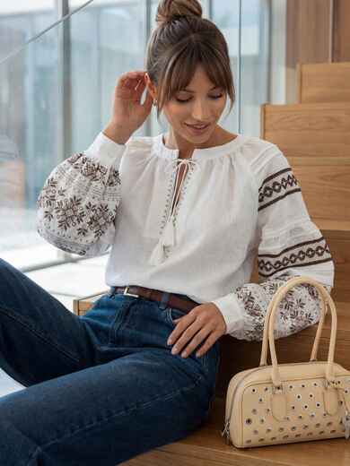 Блузка в етнічному стилі. Горловина з вирізом на зав'язках з китицями. Об'ємні рукави декоровані вишитим орнаментом.