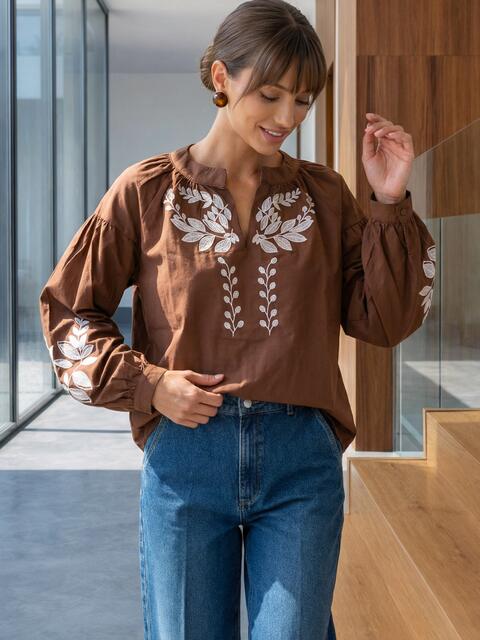 Блузка шоколадного відтінку з натуральної повітропроникної тканини. Модель прикрашена вишивкою з рослинним орнаментом. V-подібний виріз доповнений стійкою. Вільний крій забезпечує комфорт і свободу руху.