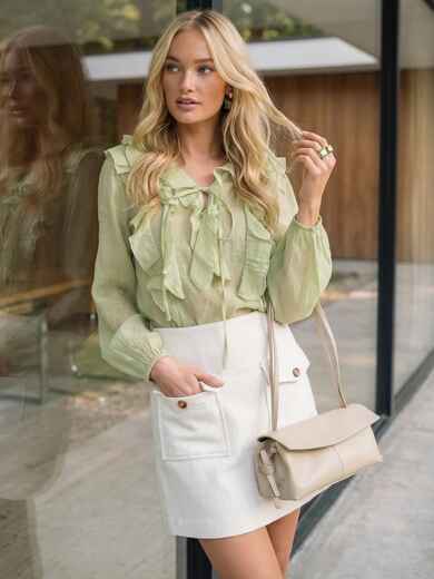 Модель вільного крою з V-подібним вирізом та зав'язками на горловині. Рюші розміщені каскадом по всій передній частині, що робить блузку виразною. Рукав об'ємний, зібраний на гумку.