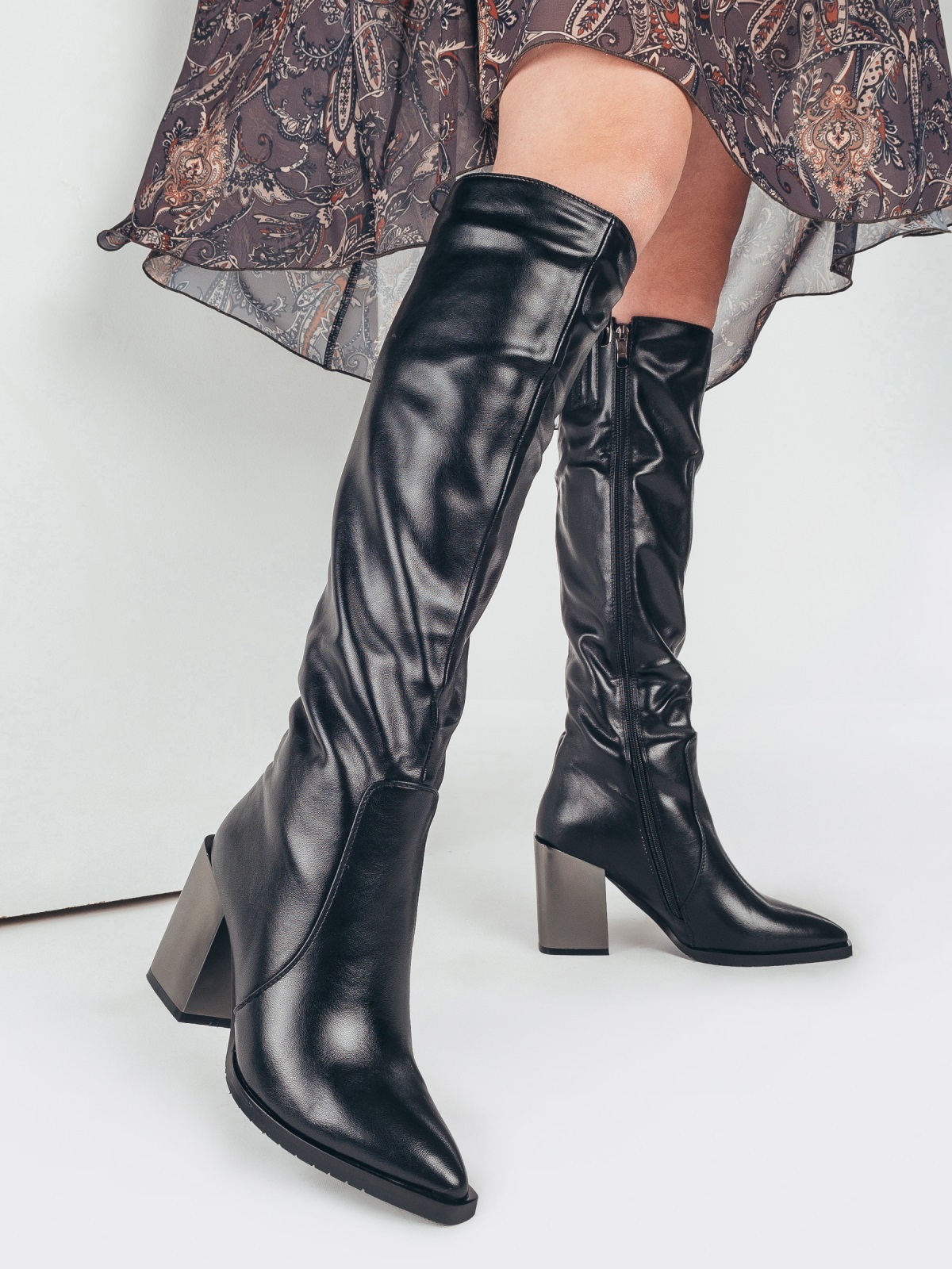 Зимові чоботи із загостреним носком чорні. Зразок зі слідами клею на лівому чоботі та дефект каблука на правому чоботі.