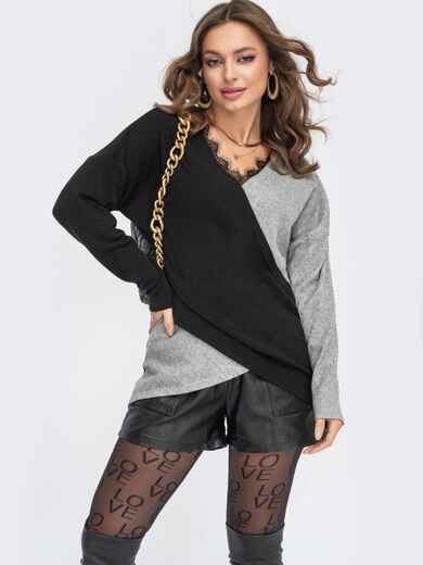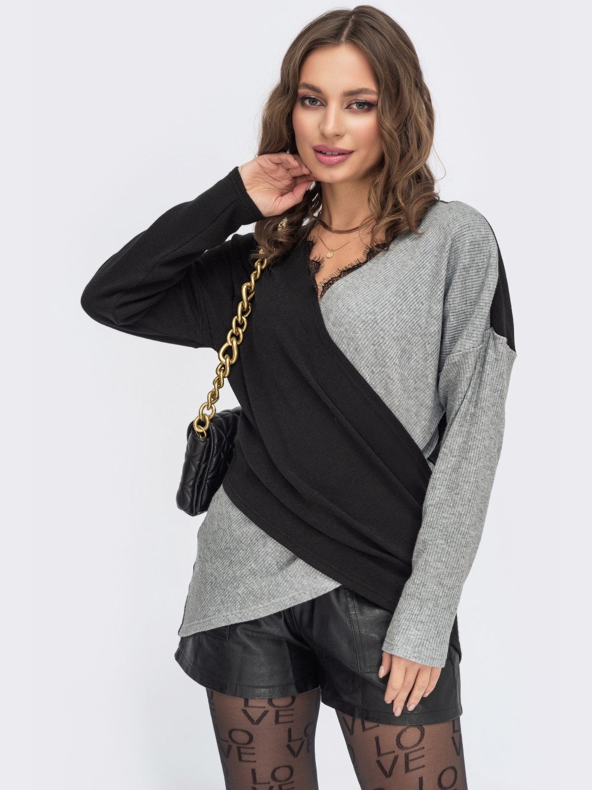 Джемпер з фіксованим запахом. V-подібний виріз горловини декорований м'яким мереживом.