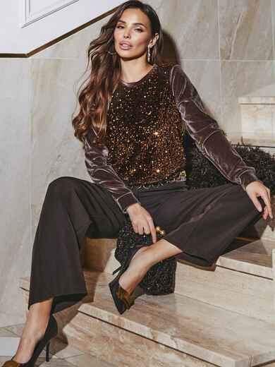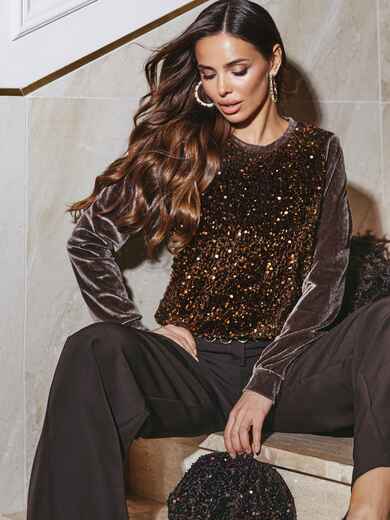 Комбінований джемпер з велюру та паєток. Передбачена підкладка із м'якої сітки на передній частині виробу.