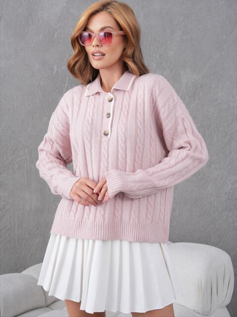 В'язаний джемпер з відкладним коміром із високоякісного турецького матеріалу. Виріб дрібної в'язки з косами та довгими рукавами. Застібається на гудзики.
