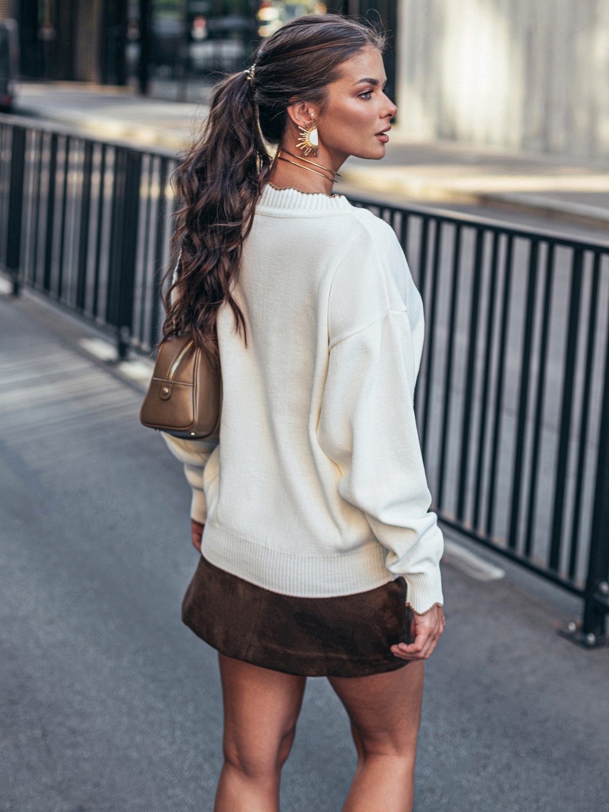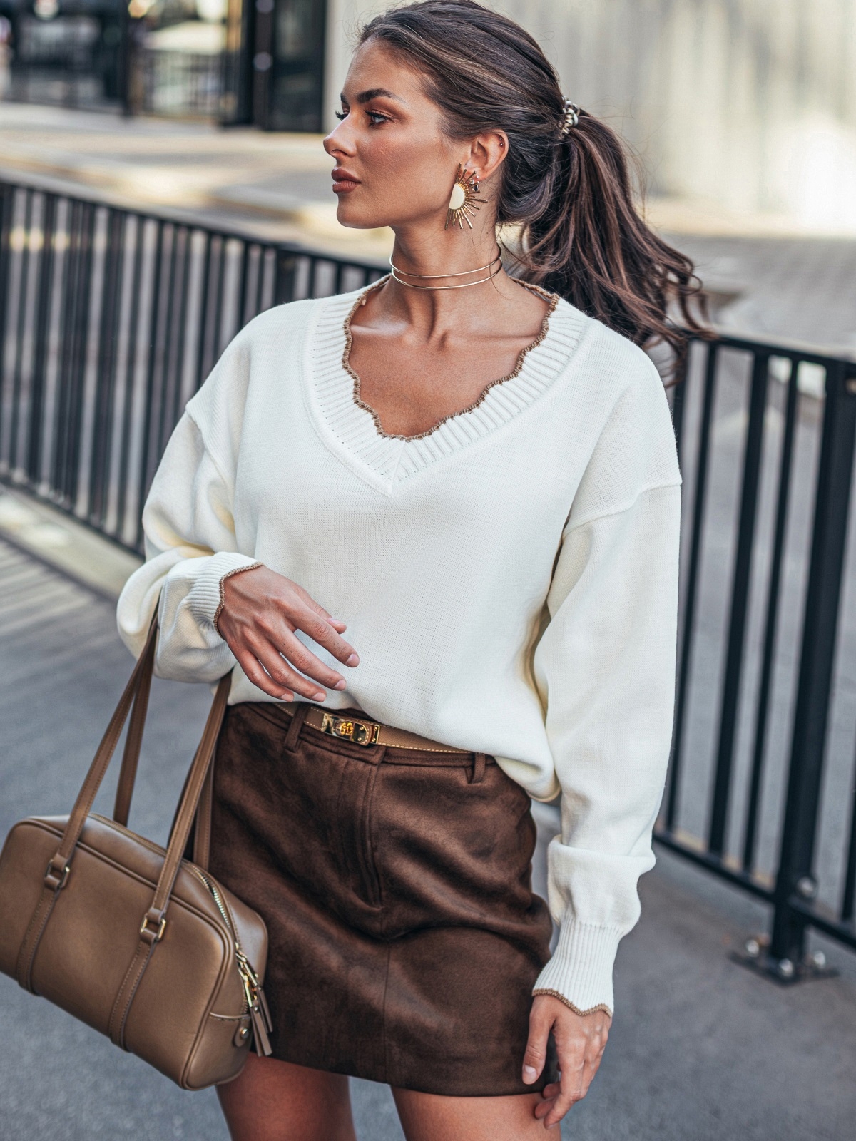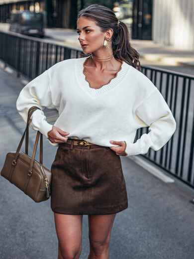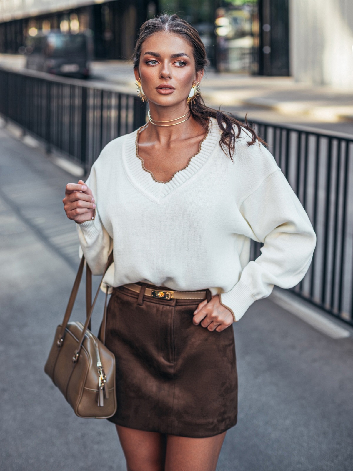 Джемпер вільного крою, що забезпечує комфортну посадку. Спущені рукави не сковують рухів, а манжети фіксують їх. V-подібний виріз і манжети з декоративним краєм.