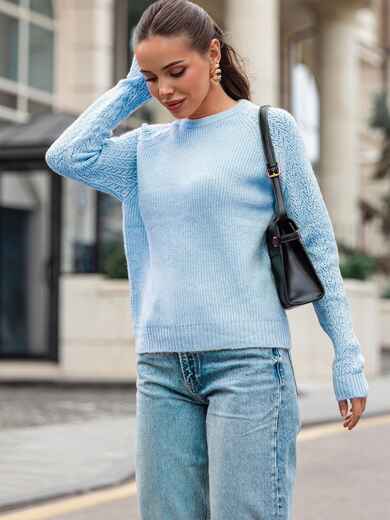 Джемпер дрібної в'язки з високоякісного турецького матеріалу. Виріб вільного крою. З круглою горловиною та рукавами-реглан з перфорацією.