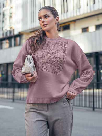 В’язаний светр із м’якої пряжі. Модель вільного крою забезпечує комфорт у носінні. Ажурне плетіння з перфорацією та квітковим мотивом на грудях і рукавах створює виразний акцент. Кругла горловина, низ і широкі манжети виконані у техніці «гумка», завдяки чому добре тримають форму та забезпечують акуратну посадку.