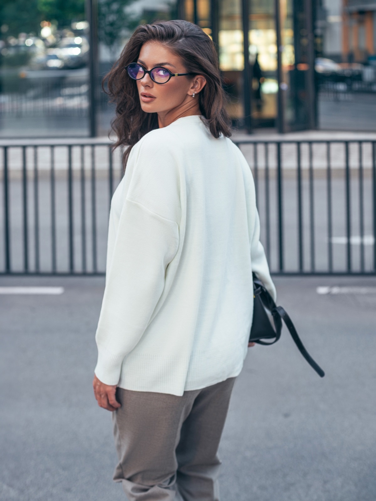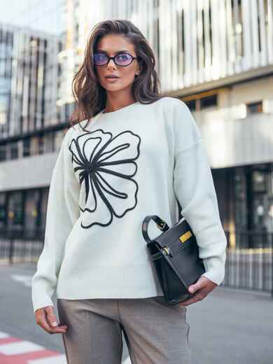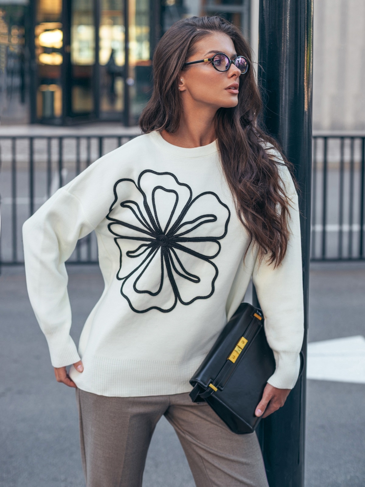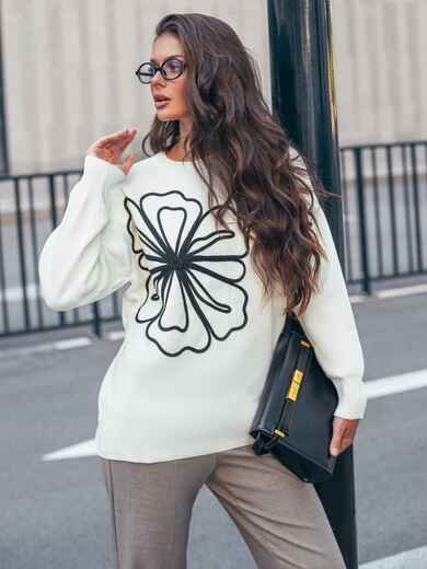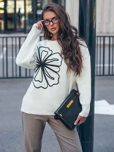 Джемпер дрібної в'язки з високоякісного турецького матеріалу. Горловина, широкі манжети та низ зв'язані у техніці гумка. Довгі рукави зі спущеним плечем. Спереду декорований квіткою із джгута.