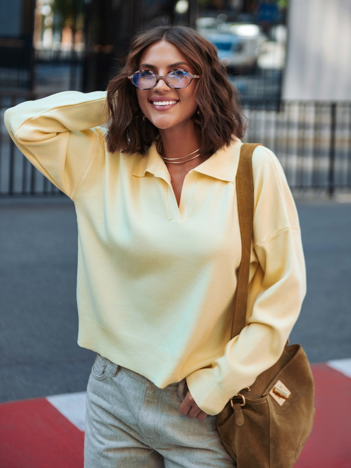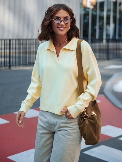 В'язаний джемпер із високоякісного турецького матеріалу. Модель вільного крою. З відкладним коміром та спущеним плечем. Манжети та низ виконані у техніці гумка.