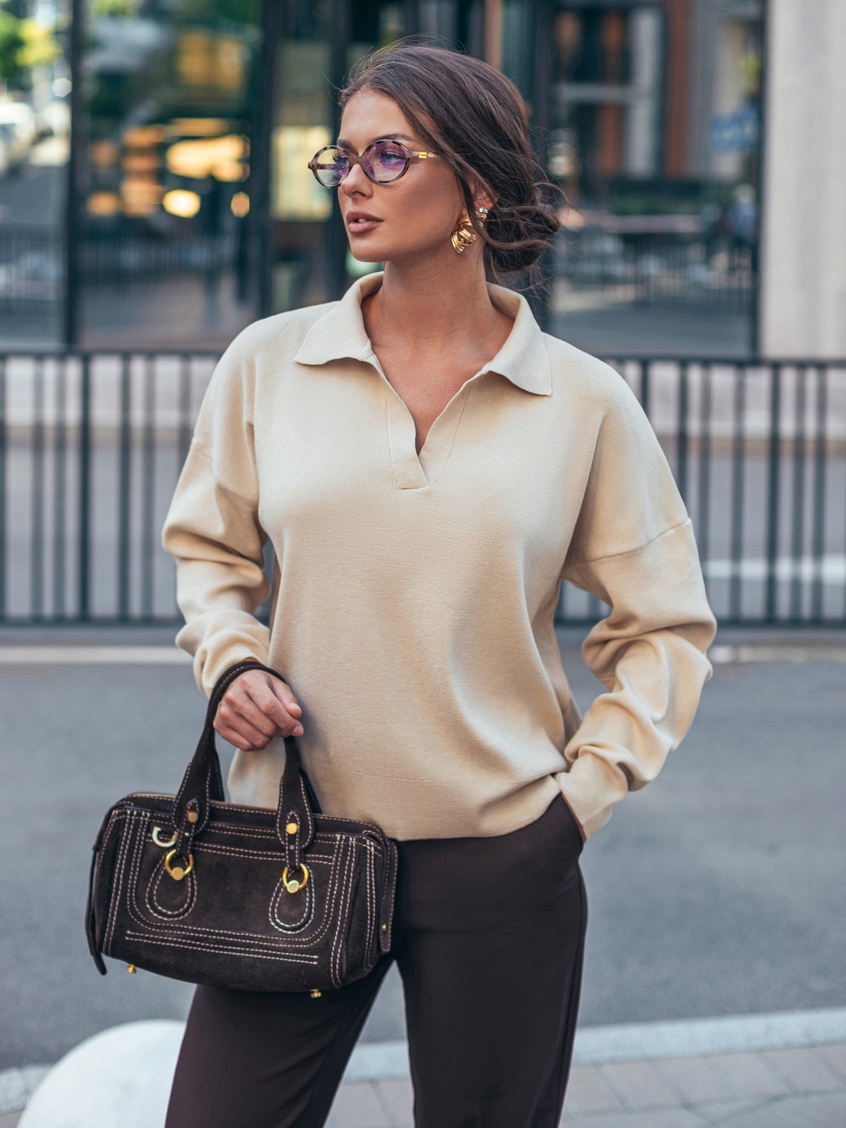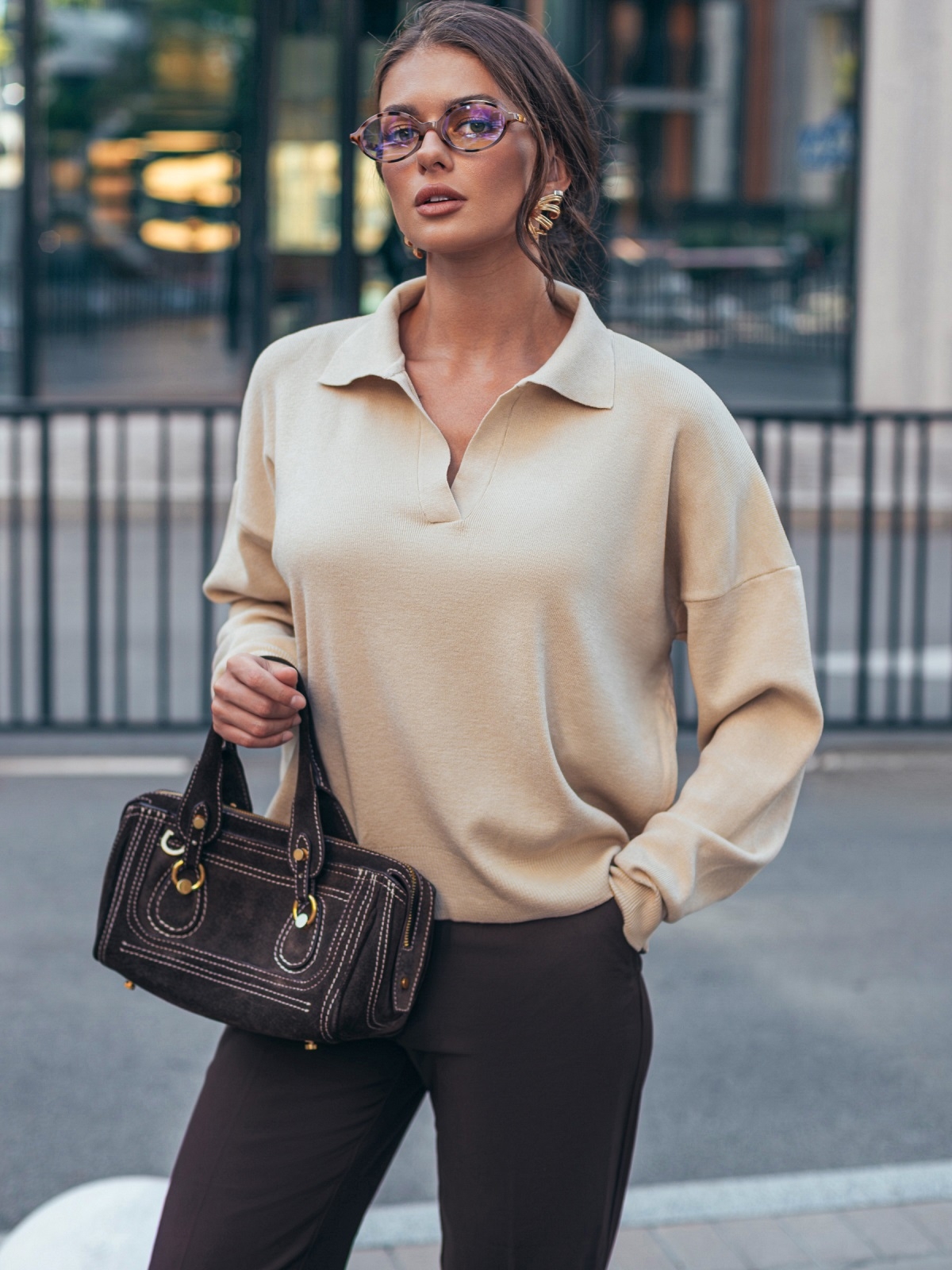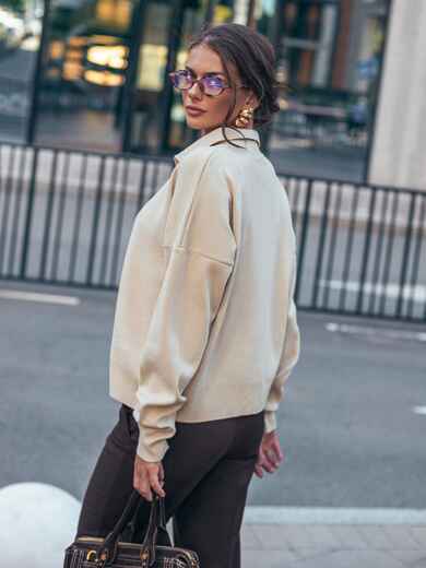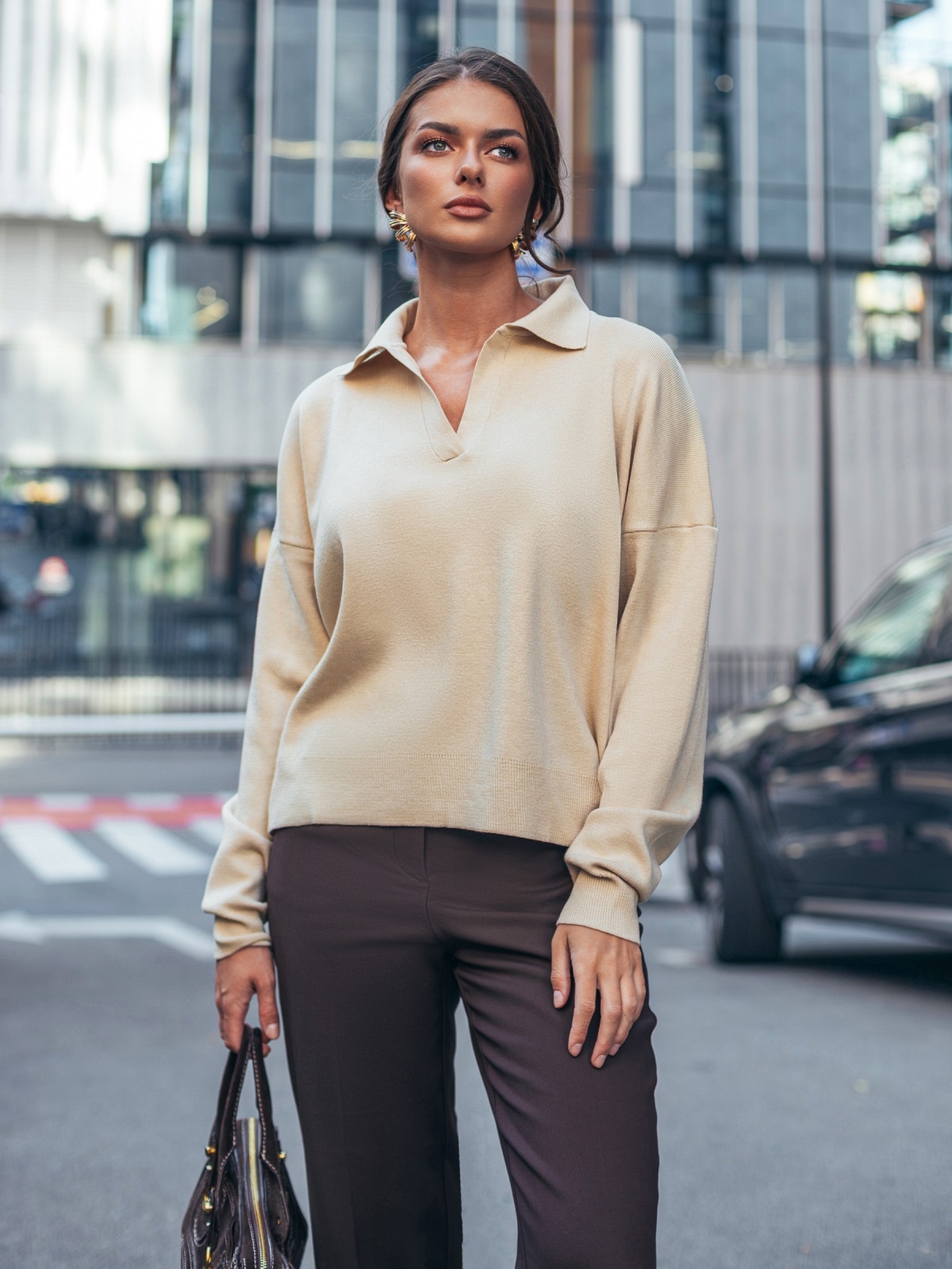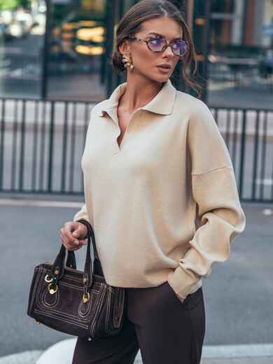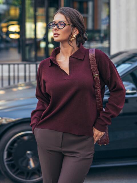 В'язаний джемпер із високоякісного турецького матеріалу. Модель вільного крою. З відкладним коміром та спущеним плечем. Манжети та низ виконані у техніці гумка.