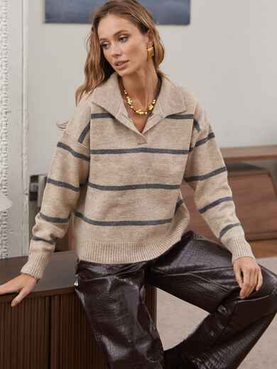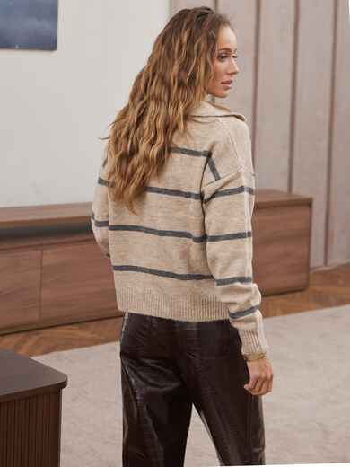 В'язаний джемпер з високоякісного турецького матеріалу. Модель з актуальним коміром-поло. Манжети і низ зв'язані гумкою для фіксації.