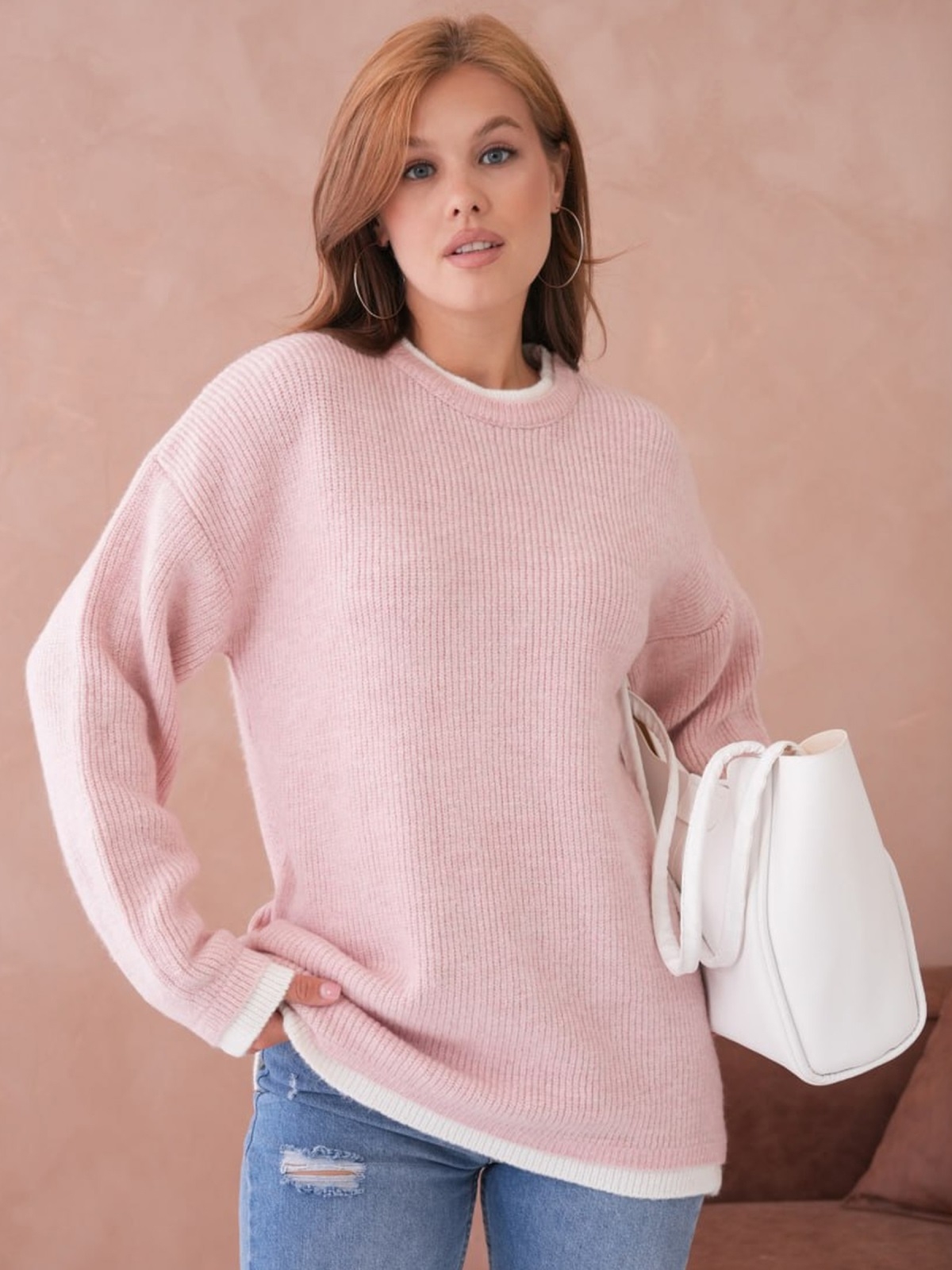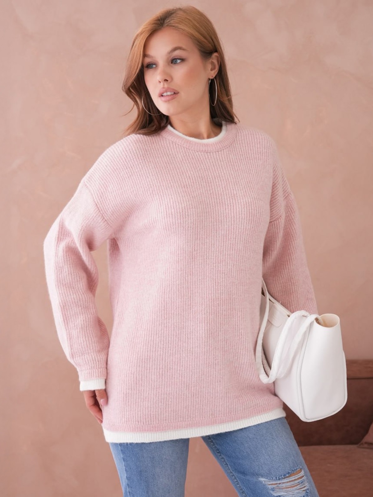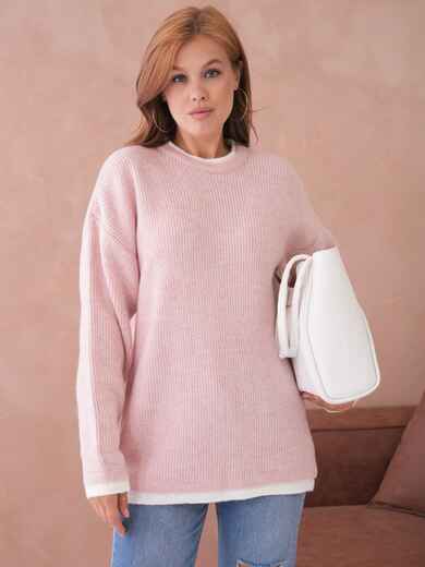 Подовжений джемпер з високоякісного турецького матеріалу. Модель з виразною текстурою завдяки об'ємній в'язці гумкою. Спущена лінія плеча комфортна в посадці. Контрастні білі акценти на манжетах і по низу створюють ефект багатошаровості.
