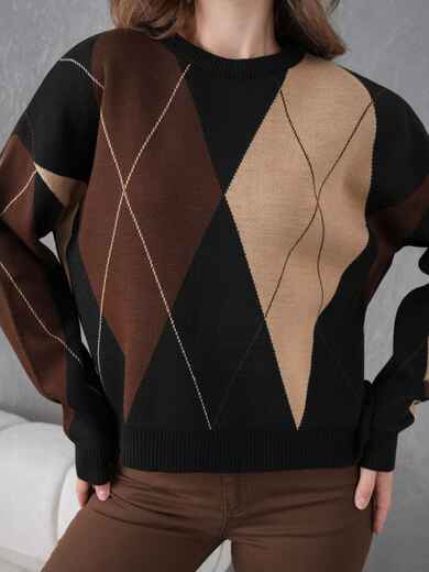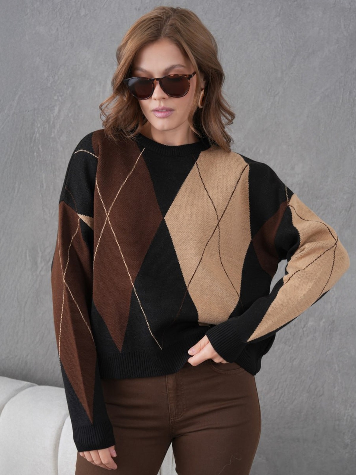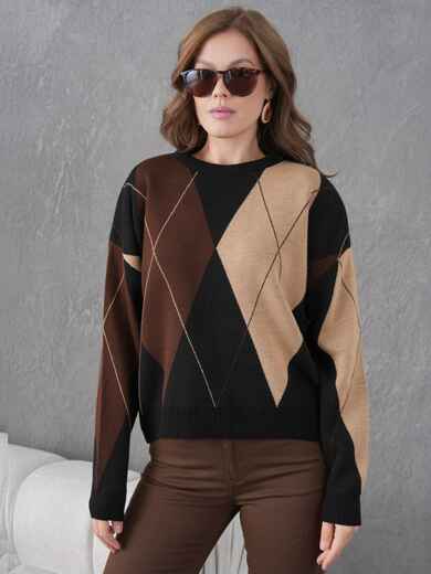 В'язаний джемпер з високоякісного турецького матеріалу з ромбоподібним візерунком. Круглий виріз горловини, манжети і низ виробу виконані гумкою.