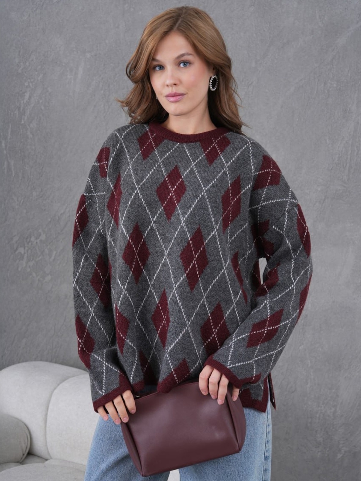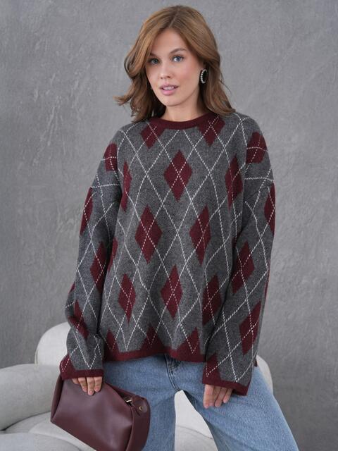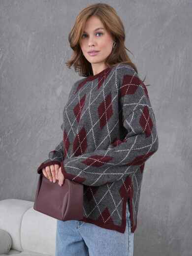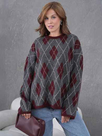 В'язаний джемпер з високоякісного турецького матеріалу. Модель з контрастним візерунком у ромби. Спущена лінія плеча і вільний крій забезпечують комфортну посадку.