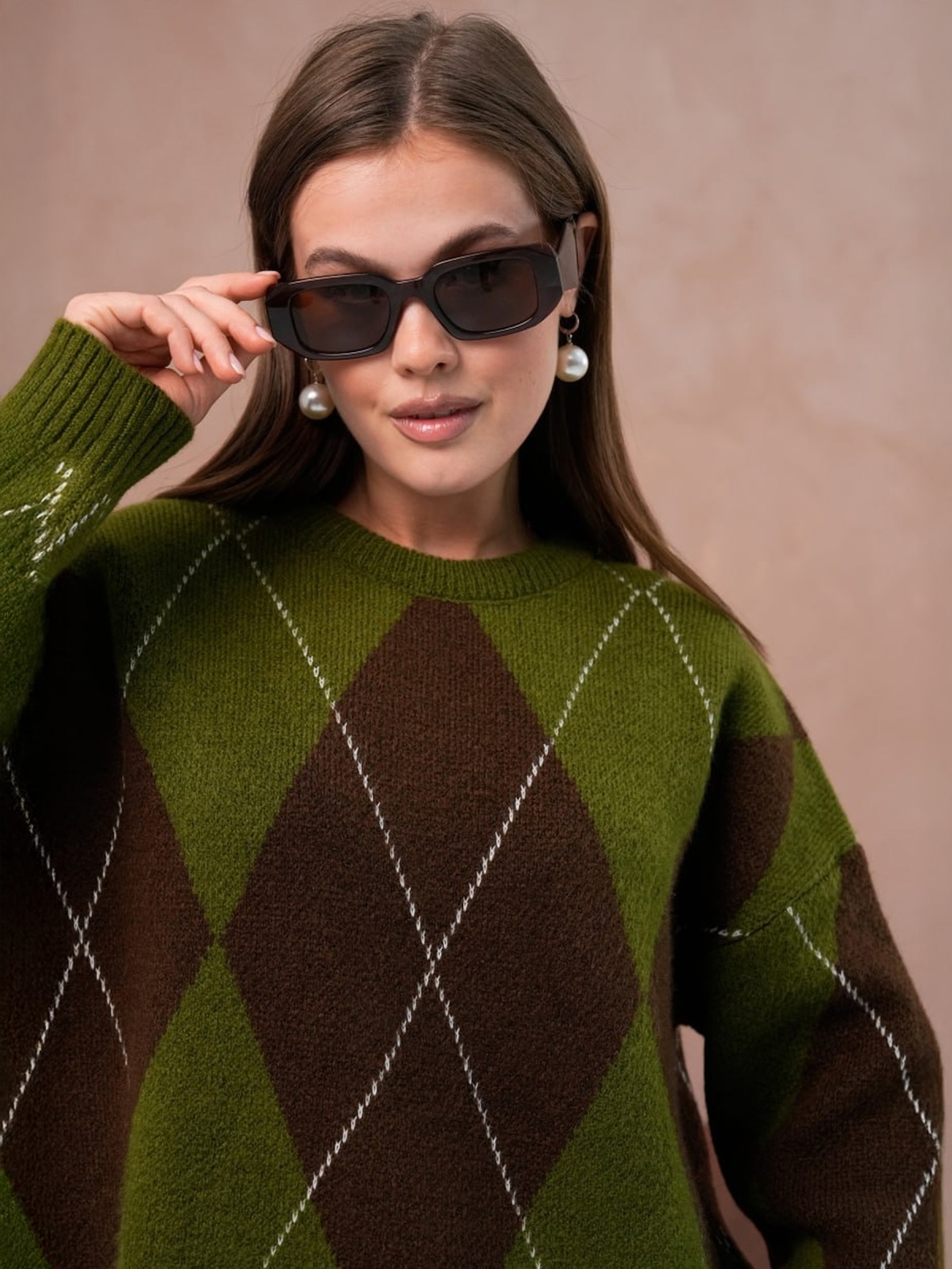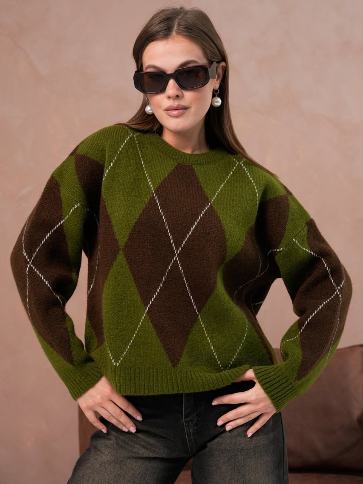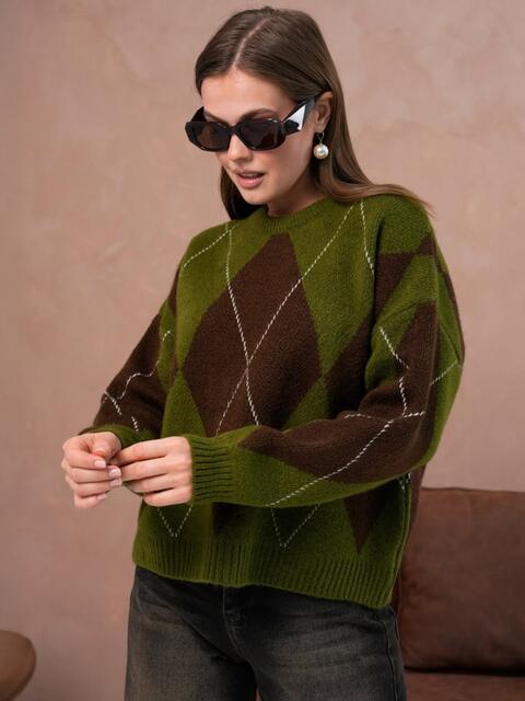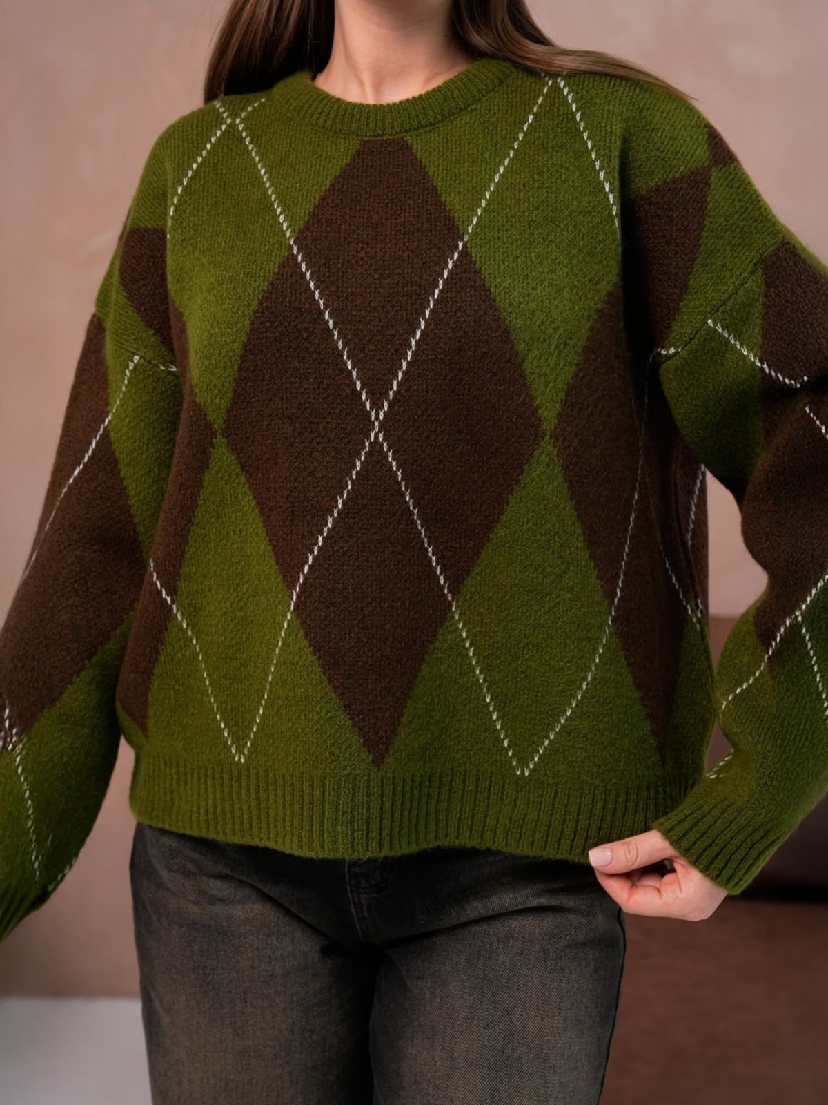 В'язаний джемпер з високоякісного турецького матеріалу з ромбоподібним візерунком. Круглий виріз горловини, манжети і низ виробу виконані гумкою.