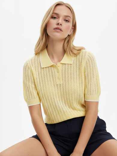 В’язана футболка-поло з контрастним кантом на комірі та манжетах. Вертикальна фактура додає структурності та забезпечує повітропроникність.