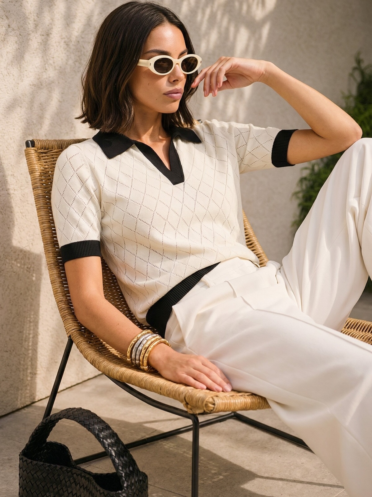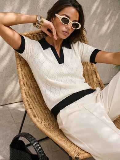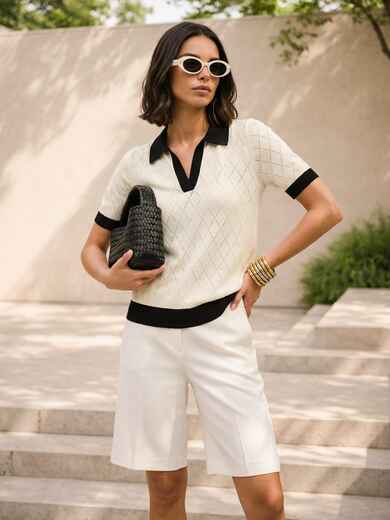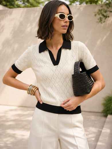 В’язана футболка з контрастною чорною окантовкою в мінімалістичному стилі виглядає стримано та сучасно. Біла основа підкреслює свіжість образу та робить модель універсальною для базового гардероба.