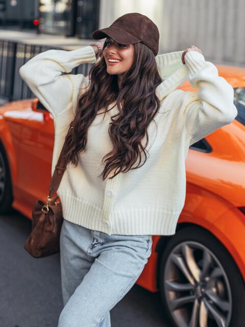 Кардиган з візерунком ромби. Модель з глибоким V-подібним вирізом і довгими рукавами. Низ виробу і манжети виконані еластичною гумкою. Застібається на ґудзики.