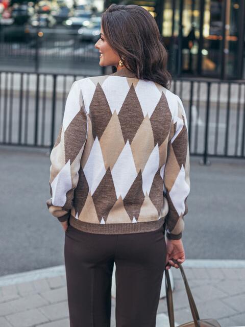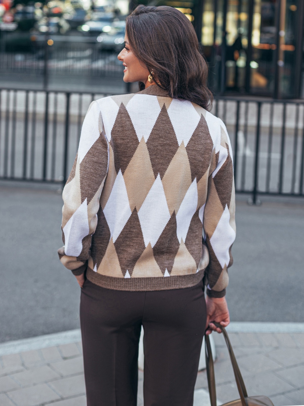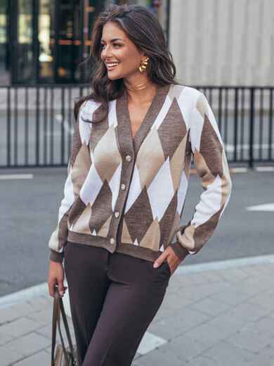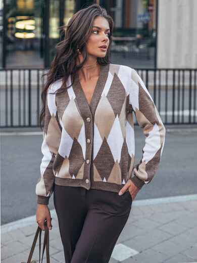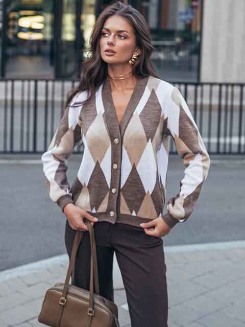 Кардиган з візерунком ромби. Модель з глибоким V-подібним вирізом і довгими рукавами. Низ виробу і манжети виконані еластичною гумкою. Застібається на ґудзики.