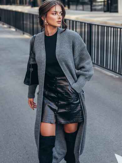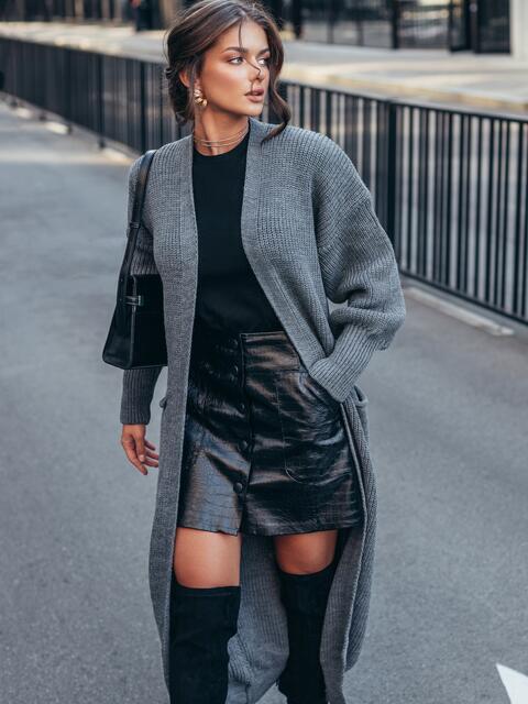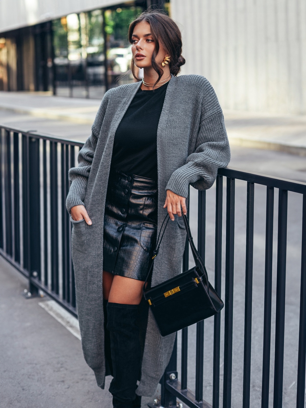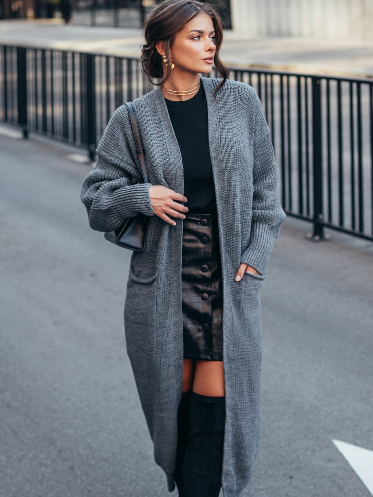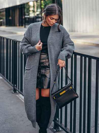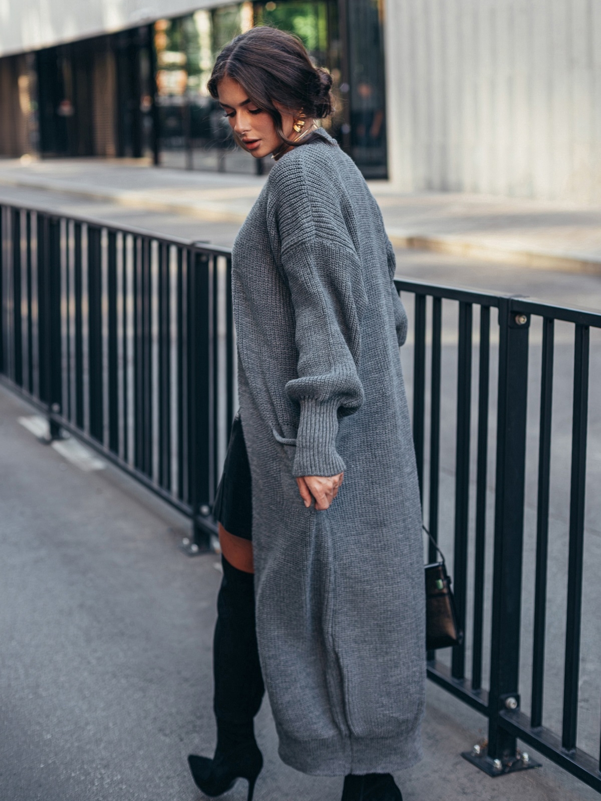 Довгий в'язаний кардиган без застібок. Модель зі спущеною лінією плечового шва, високими манжетами і об'ємними рукавами. Поличка виробу доповнена кишенями з закрученим краєм.