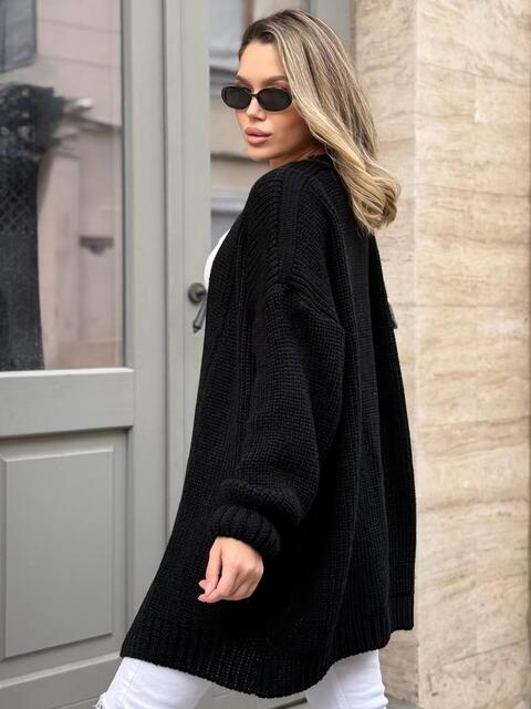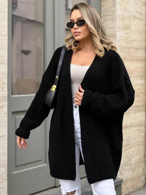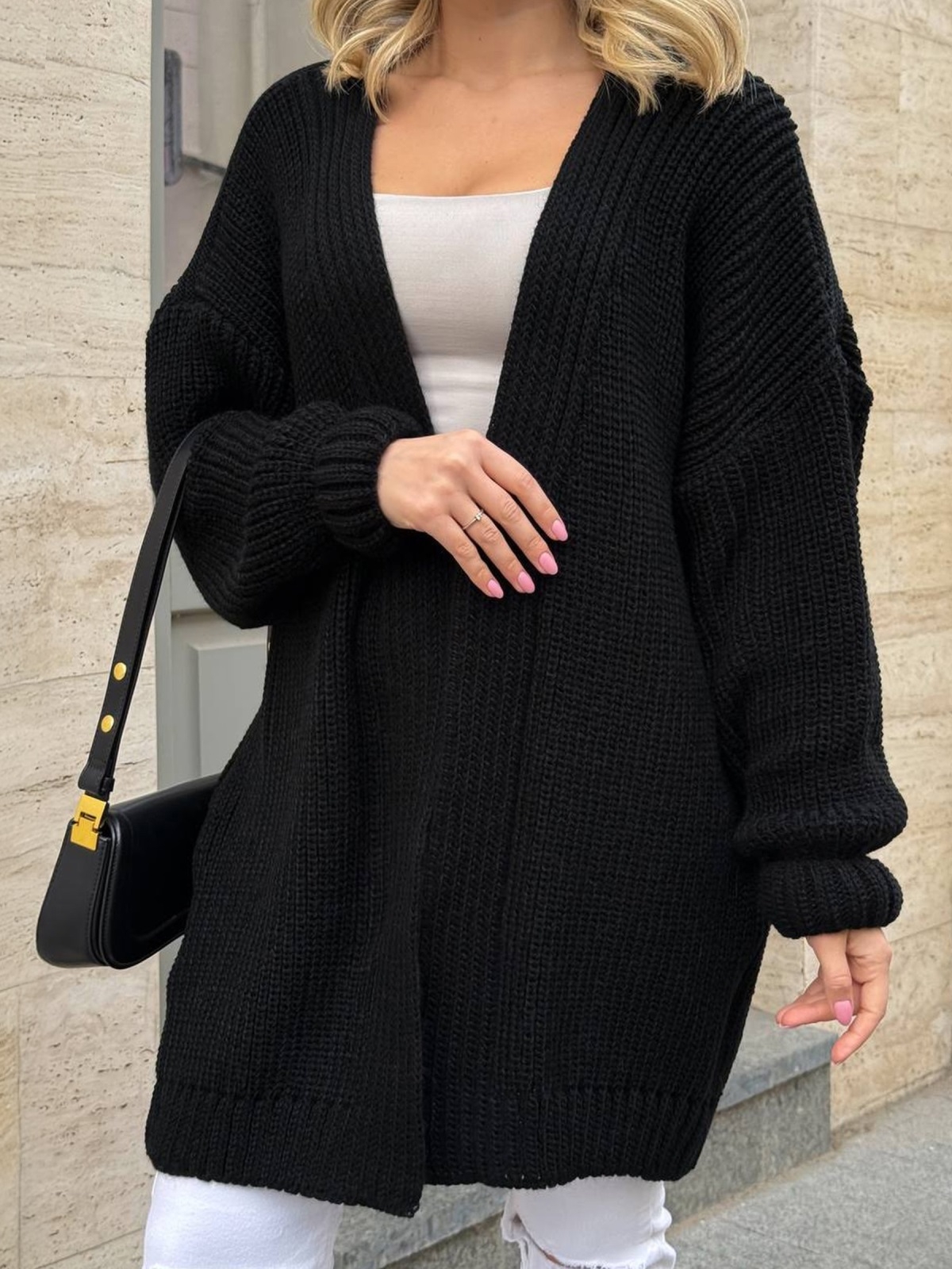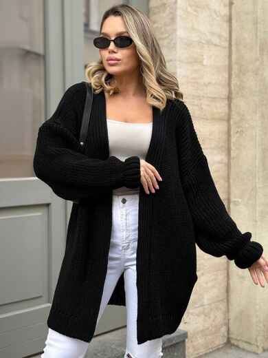 Напіввовняний кардиган дрібної в'язки. Модель з довгими рукавами та спущеним плечем. Без застібки.