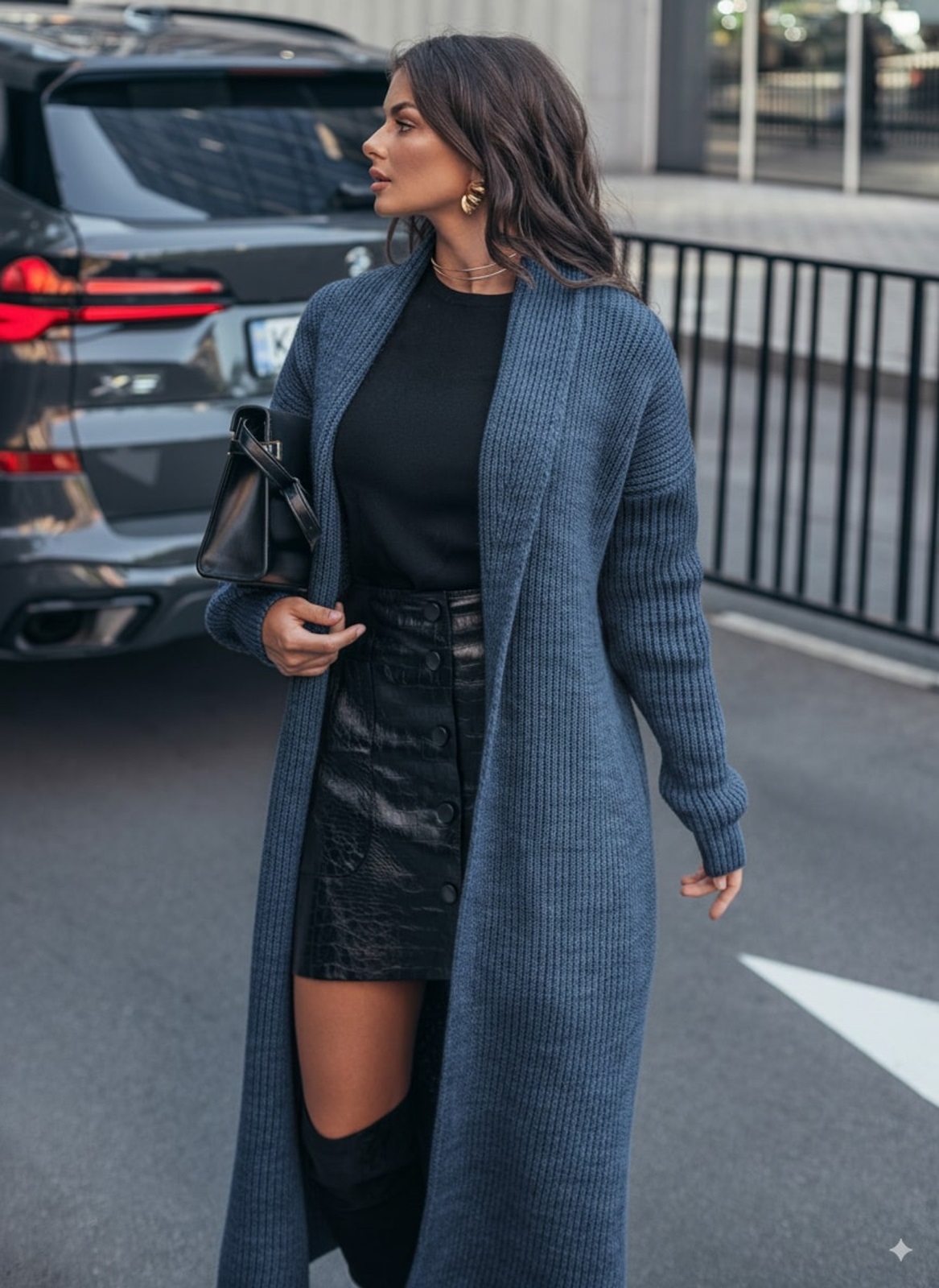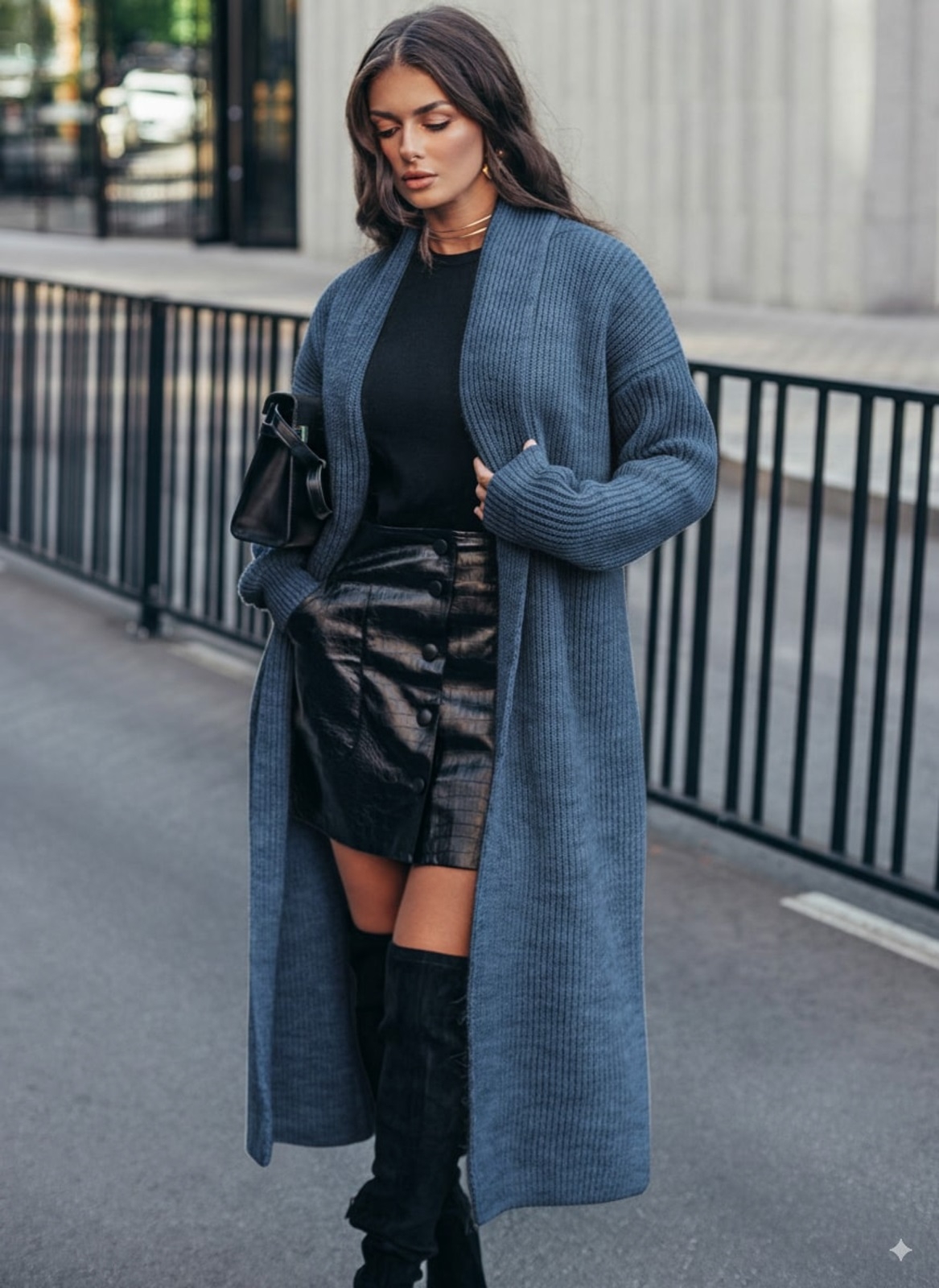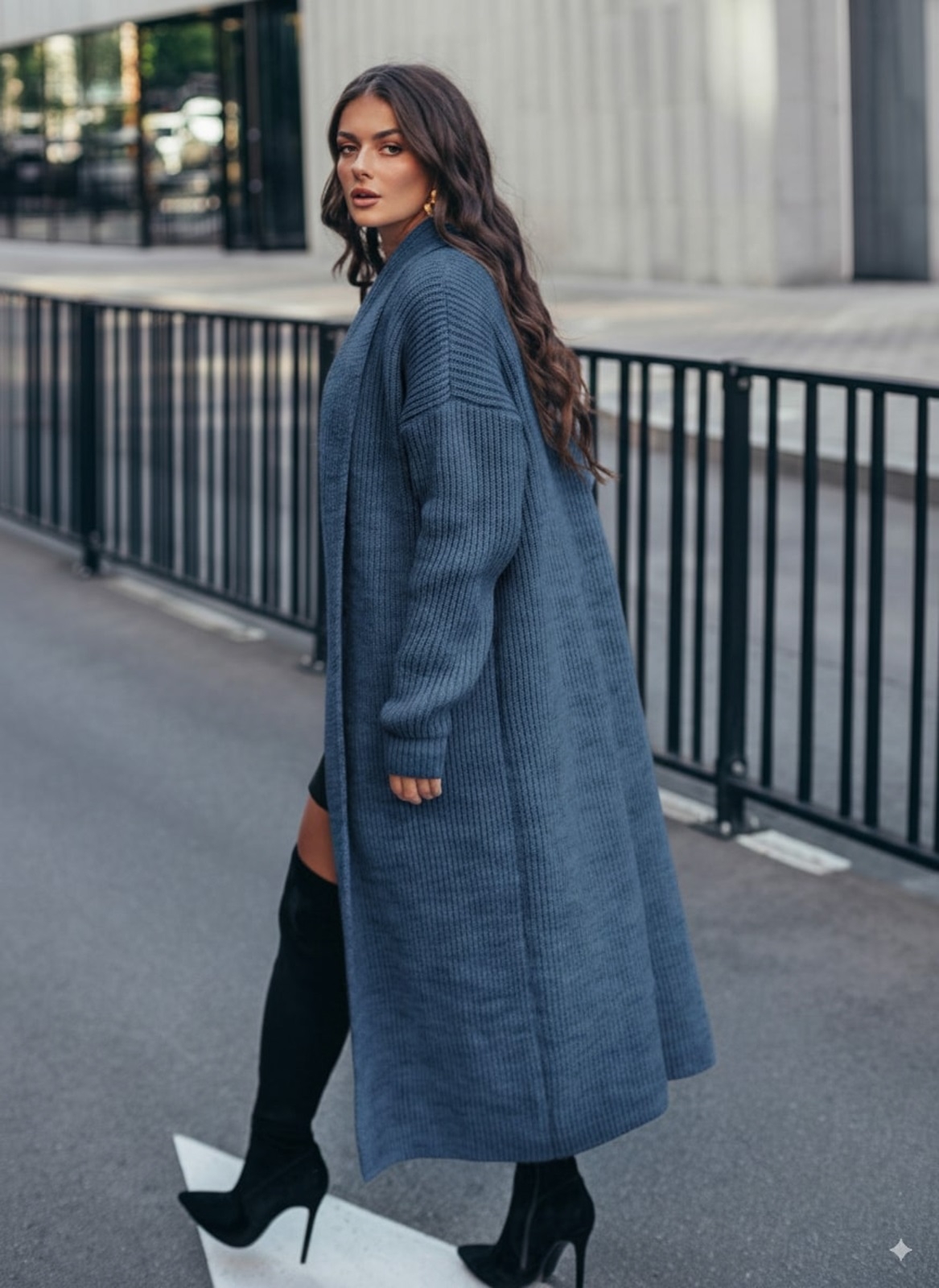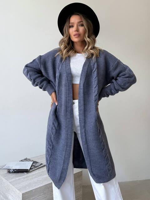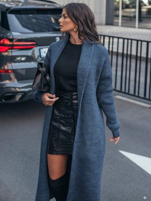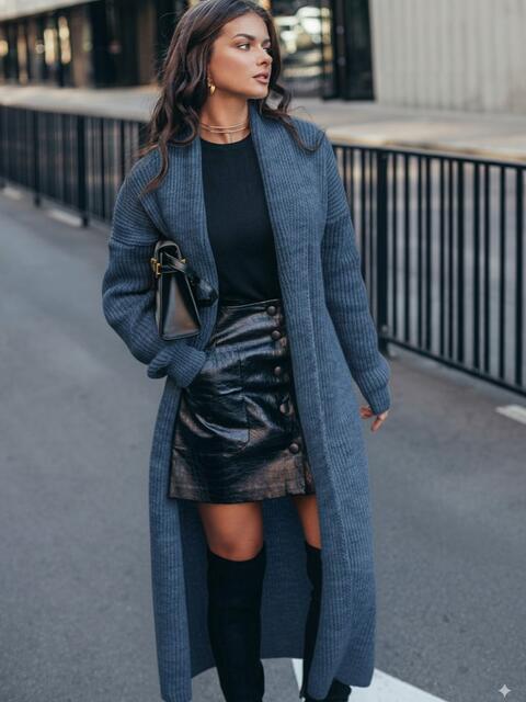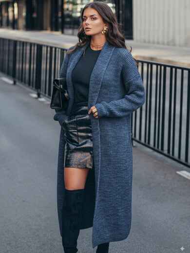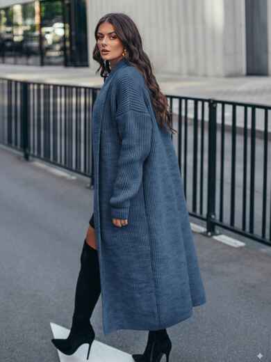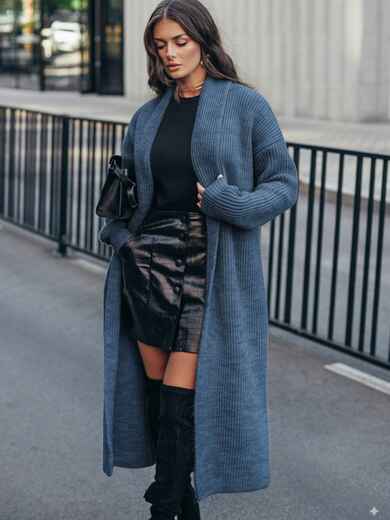 Кардиган з м'якої та щільної напіввовни, що забезпечує тепло і комфорт. Модель з широким відкладним коміром і довгими рукавами. Без застібки, що робить його універсальним для створення багатошарових образів. Пояс в комплект не входить.