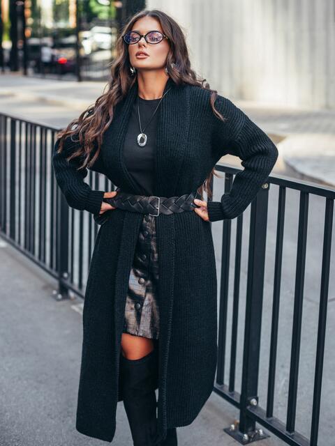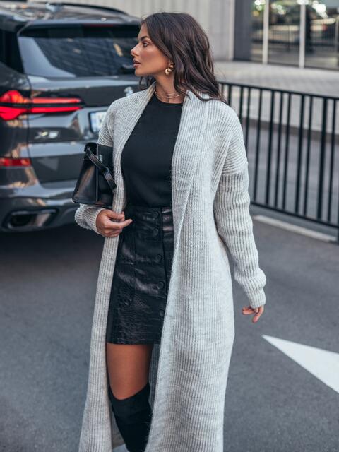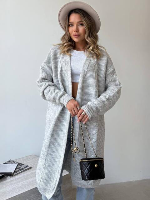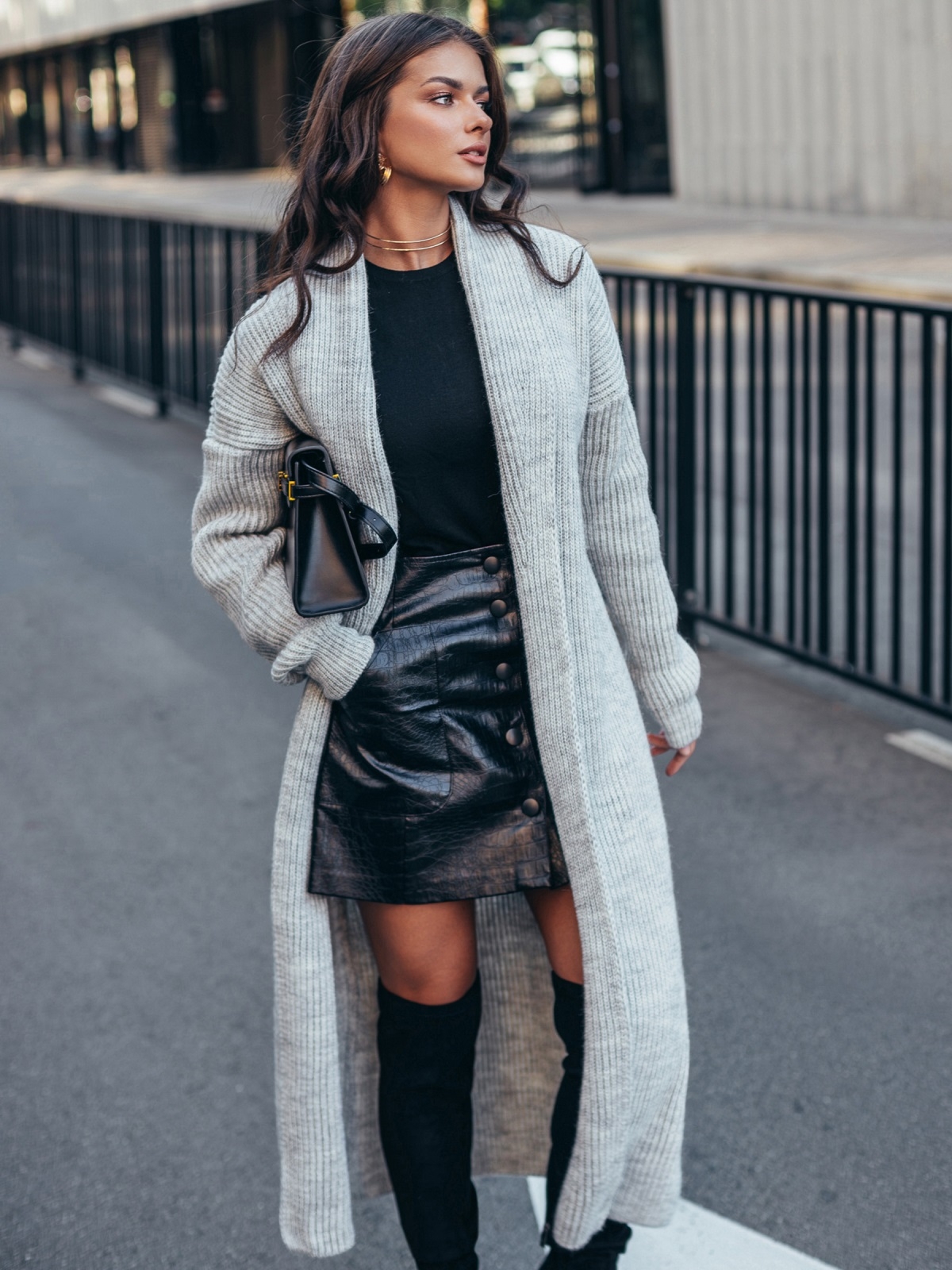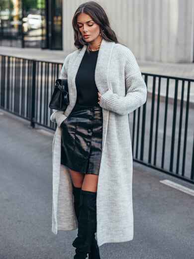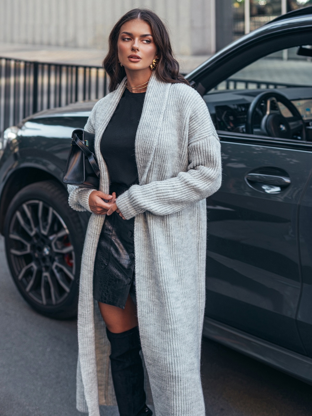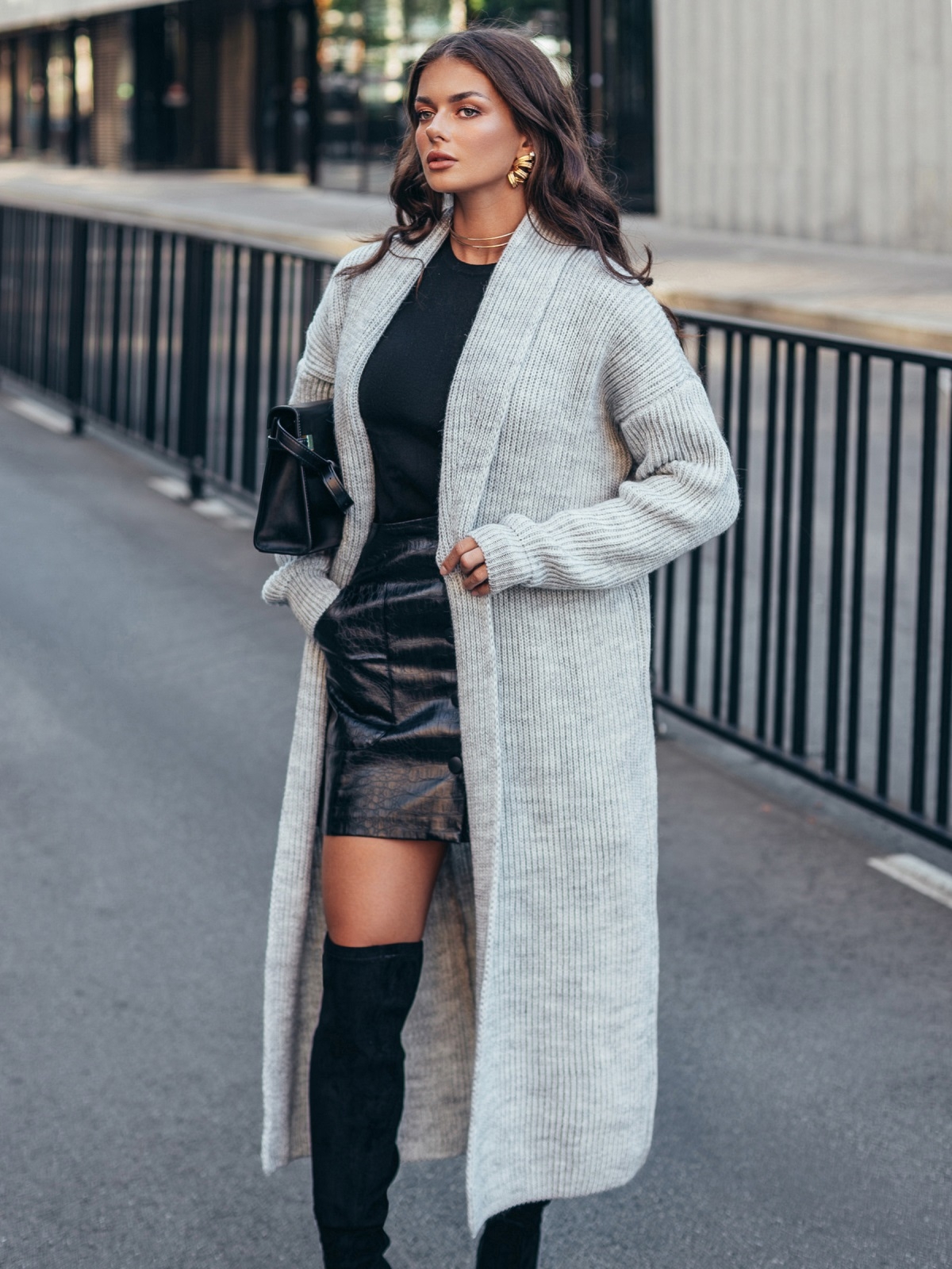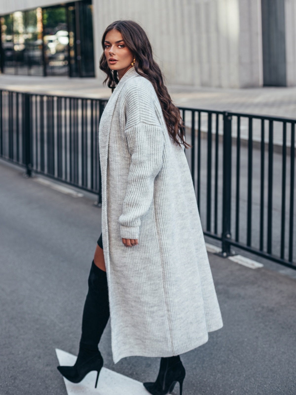 Кардиган з м'якої та щільної напіввовни, що забезпечує тепло і комфорт. Модель з широким відкладним коміром і довгими рукавами. Без застібки, що робить його універсальним для створення багатошарових образів.