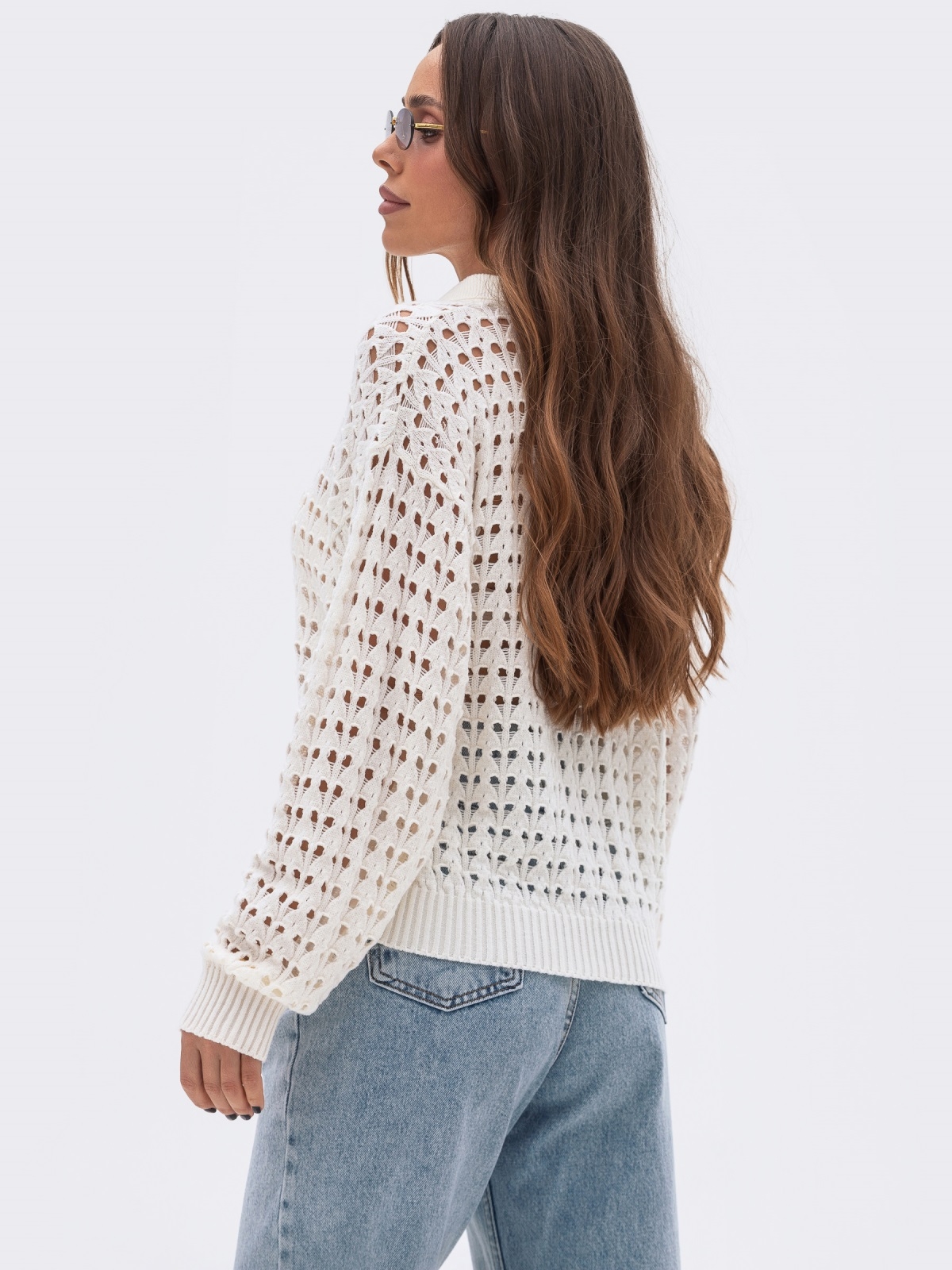 Легка бавовняна кофта ажурної в'язки. Модель із відкладним коміром, спущена лінія плеча створює розслаблений, сучасний силует. Гумка по низу підкреслює форму, надаючи виробу охайного вигляду та зручності в носці. Застібається на ґудзики.