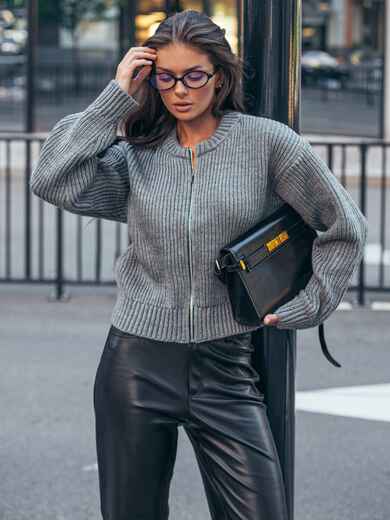 Кофта дрібної в'язки прямого крою. Виріб зі спущеним плечем. Манжети та низ зв'язані широкою гумкою. Застібається на блискавку спереду.