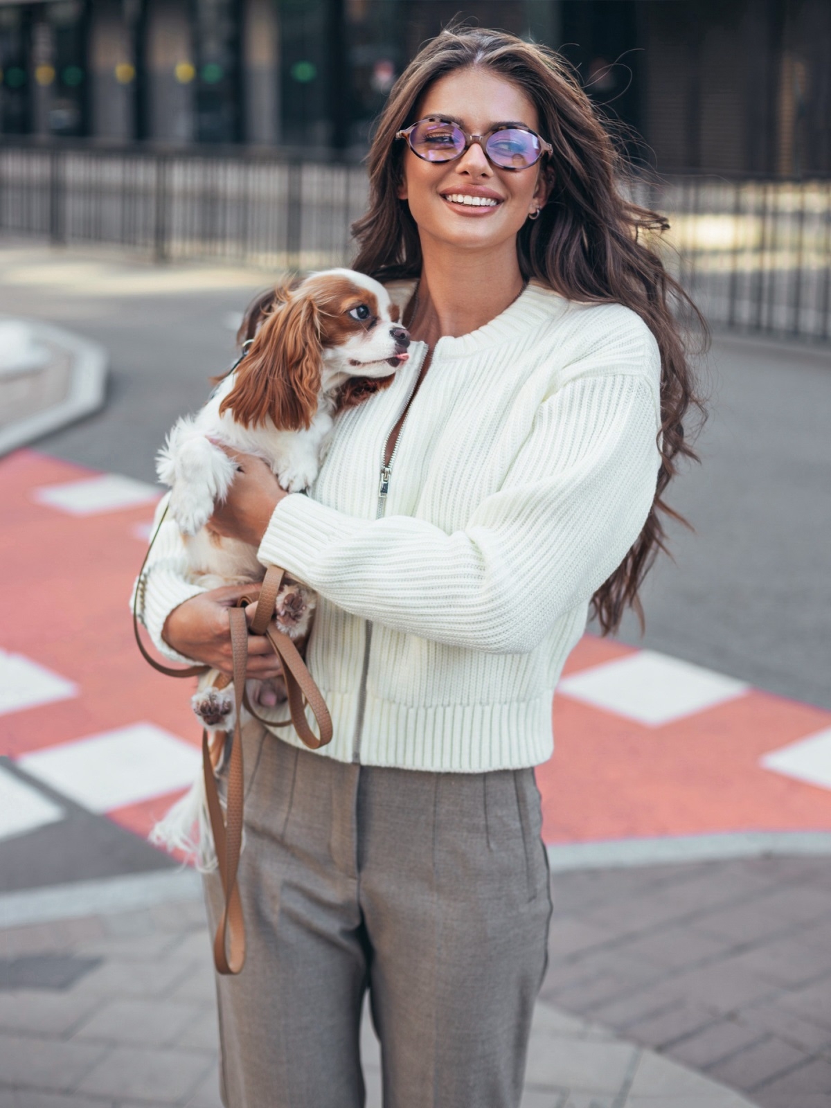 Кофта дрібної в'язки прямого крою. Виріб зі спущеним плечем. Манжети та низ зв'язані широкою гумкою. Застібається на блискавку спереду.