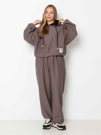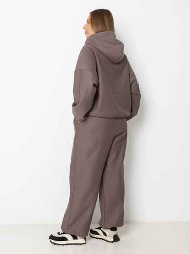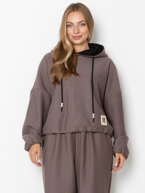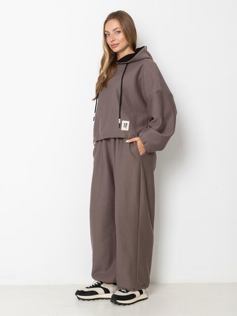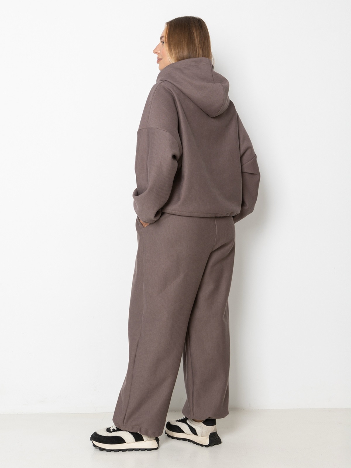 Костюм у спортивному стилі з трикотажу Лакоста з начосом. Худі в стилі oversize з об'ємними рукавами. Модель з подвійним капюшоном з глибокою посадкою. Низ виробу і рукава регулюються внутрішньою куліскою. Збоку розташована нашивка. Штани широкого крою. Низ регулюється куліскою. Еластичний пояс забезпечує зручну посадку.
